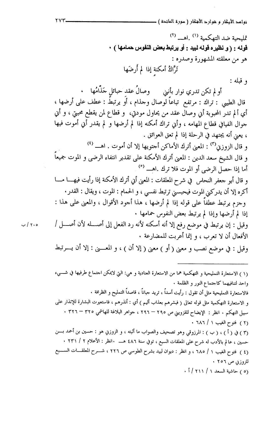 قوله: (ونظيره قوله لبيد: أو يرتبط بعض النفوس حمامها).