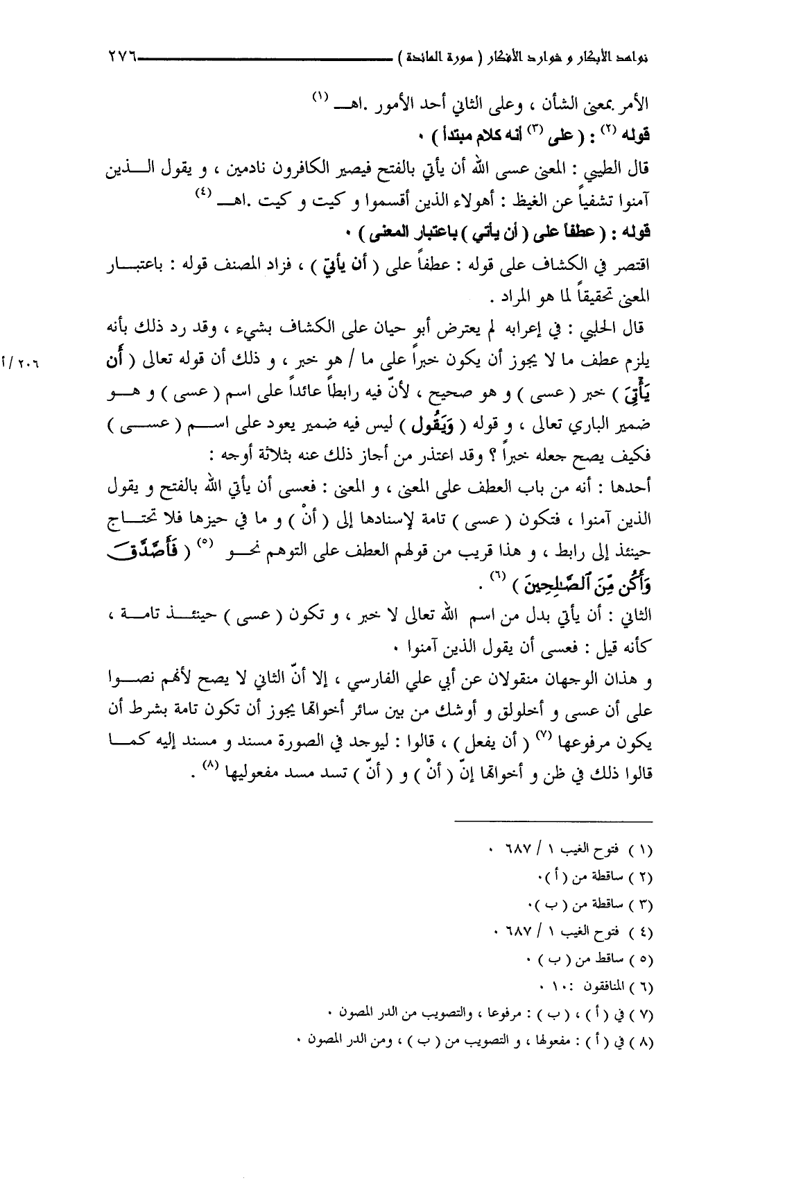 أحدها: أنه من باب العطف على المعنى، والمعنى: فعسى أن يأتي الله بالفتح ويقول الذين آمنوا، فتكون (عسى) تامة لإسنادها إلى (أنْ) وما في حيزها فلا تحتاج حينئذ إلى رابط، وهذا قريب من قولهم العطف على التوهم نحو (فَأَصَّدَّقَ وَأَكُنْ مِنَ الصَّالِحِينَ).