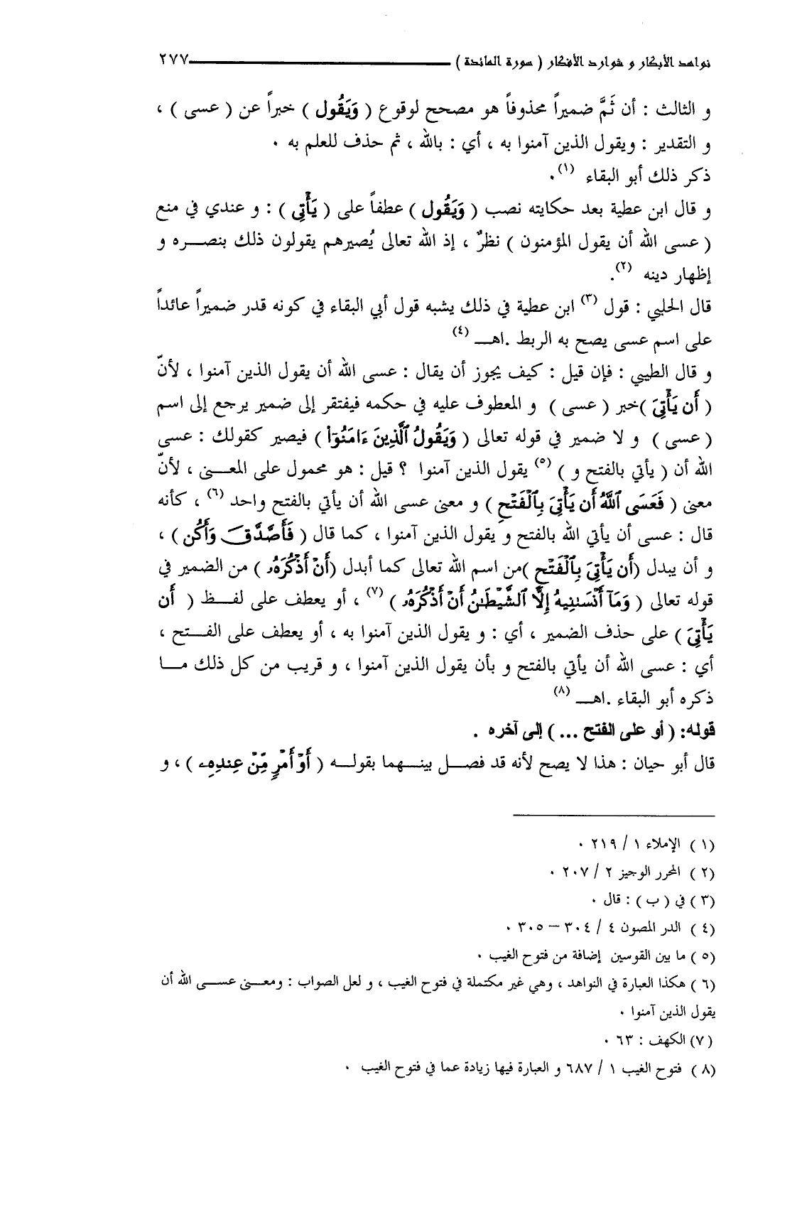 وقال الطَّيبي: فإن قيل: كيف يجوز أن يقال: عسى الله أن يقول الذين آمنوا، لأنَّ (أَنْ يَأْتِيَ) خبر (عسى) والمعطوف عليه في حكمه فيفتقر إلى ضمير يرجع إلى اسم (عسى) ولا ضمير في قوله تعالى (وَيَقُولُ الَّذِينَ آمَنُوا) فيصير كقولك: عسى الله أن (يأتي بالفتح) ويقول الذين آمنوا؟ قيل: هو محمول على المعنى، لأنّ معنى (فَعَسَى اللهُ أَنْ يَأْتِيَ بِالْفَتْحِ) ومعنى عسى الله أن يأتي بالفتح واحد، كأنه قال: عسى أن يأتي الله بالفتح ويقول الذين آمنوا، كما قال (فَأَصَّدَّقَ وَأَكُنْ)، وأن يبدل (أَنْ يَأْتِيَ بِالْفَتْحِ) من اسم الله تعالى كما أبدل (أَنْ أَذْكُرَهُ) من الضمير في قوله تعالى (وَمَا أَنْسَانِيهُ إِلاّ الشَّيْطَانُ أَنْ أَذْكُرَهُ)، أو يعطف على لفظ (أَنْ يَأْتِيَ) على حذف الضمير، أي: ويقول الذين آمنوا به، أو يعطف على الفتح، أي: عسى الله أن يأتي بالفتح وبأن يقول الذين آمنوا، وقريب من كل ذلك ما ذكره أبو البقاء. اهـ