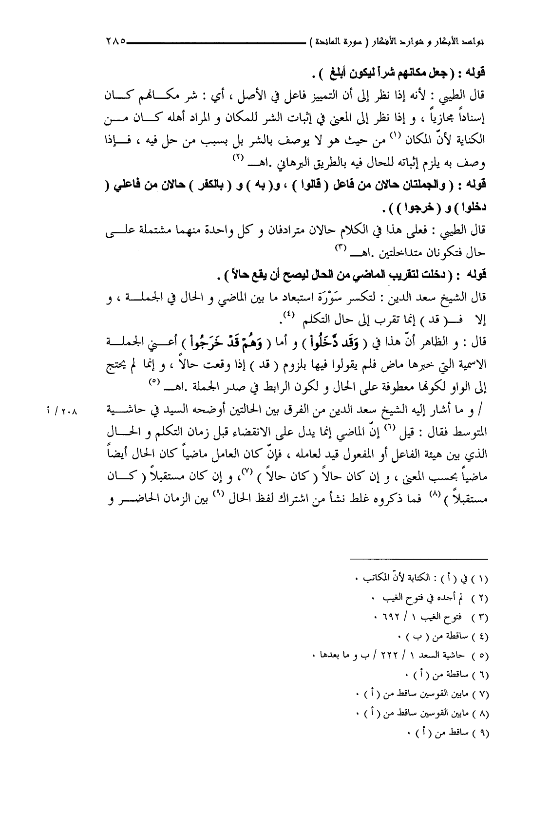 وما أشار إليه الشيخ سعد الدين من الفرق بين الحالتين أوضحه السيد في حاشية المتوسط فقال: قيل إنَّ الماضي إنما يدل على الانقضاء قبل زمان التكلم والحال الذي بين هيئة الفاعل أو المفعول قيد لعامله، فإنَّ كان العامل ماضياً كان الحال أيضاً ماضياً بحسب المعنى، وإن كان حالاً (كان حالاً)، وإن كان مستقبلاً (كان مستقبلاً) فما ذكروه غلط نشأ من اشتراك لفظ الحال بين الزمان الحاضر