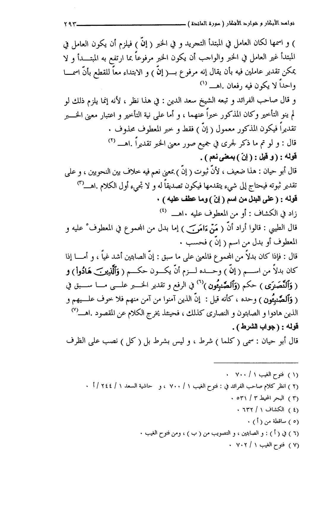 وقال صاحب الفرائد وتبعه الشيخ سعد الدين: في هذا نظر، لأنه إنما يلزم ذلك لو لم ينو التأخير وكان المذكور خبراً عنهما، وأما على نية التأخير واعتبار معنى الخبر تقديراً فيكون المذكور معمول (إنَّ) فقط وخبر المعطوف محذوف.