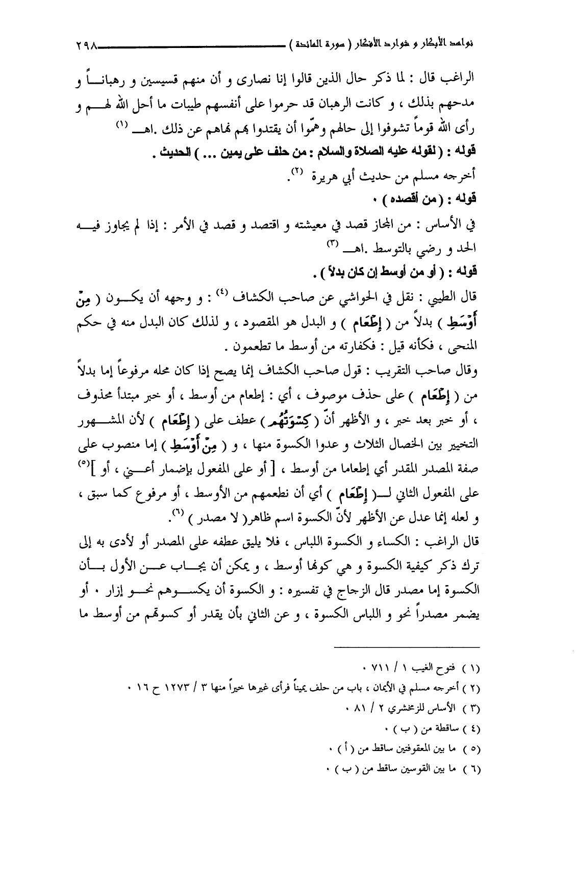وقال صاحب التقريب: قول صاحب الكشاف إنما يصح إذا كان محله مرفوعاً إما بدلاً من (إِطْعَامُ) على حذف موصوف، أي: إطعام من أوسط، أو خبر مبتدأ محذوف، أو خبر بعد خبر، والأظهر أنَّ (كِسْوَتُهُمْ) عطف على (إِطْعَامُ) لأن المشهور التخيير بين الخصال الثلاث وعدوا الكسوة منها، و (مِنْ أَوْسَطِ) إما منصوب على صفة المصدر المقدر أي إطعاماً من أوسط، أو على المفعول بإضمار أعني، أو على المفعول الثاني لـ (إِطْعَامُ) أي أن نطعمهم من الأوسط، أو مرفوع كما سبق، ولعله إنما عدل عن الأظهر لأنَّ الكسوة اسم ظاهر لا مصدر.