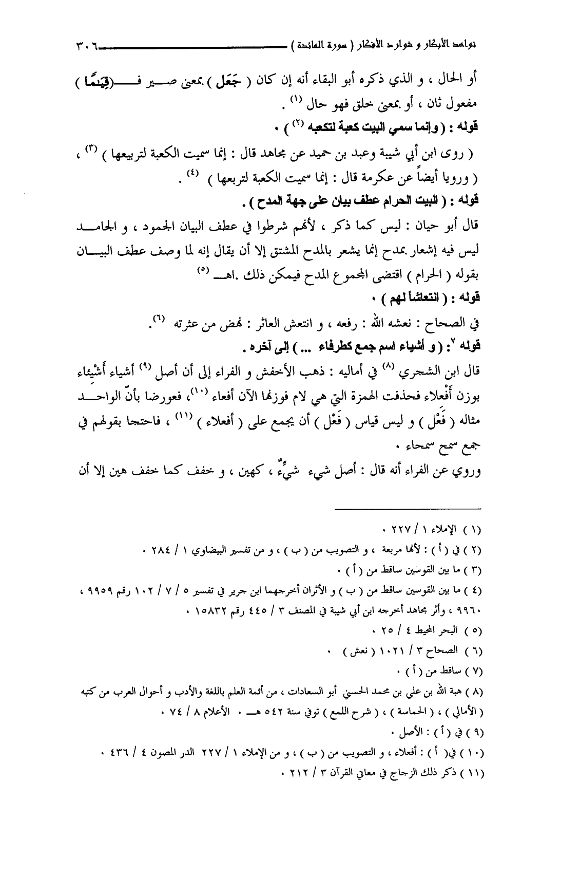 قال أبو حيان: ليس كما ذكر، لأنهم شرطوا في عطف البيان الجمود، والجامد ليس فيه إشعار بمدح إنما يشعر بالمدح المشتق إلا أن يقال إنه لما وصف عطف البيان بقوله (الحرام) اقتضى المجموع المدح فيمكن ذلك. اهـ