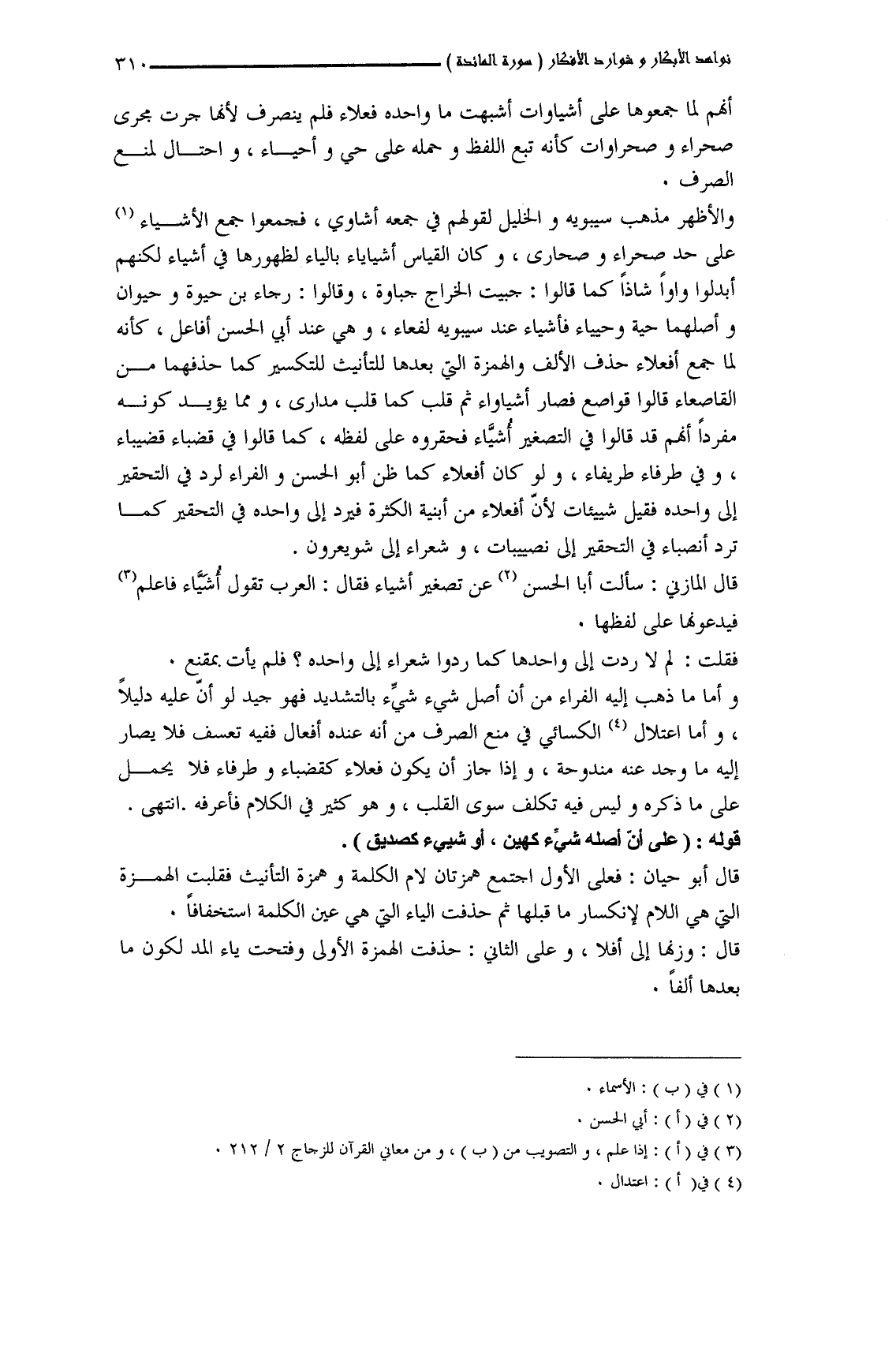قال المازني: سألت أبا الحسن عن تصغير أشياء فقال: العرب تقول أُشيَّاء فاعلم فيدعونها على لفظها.
