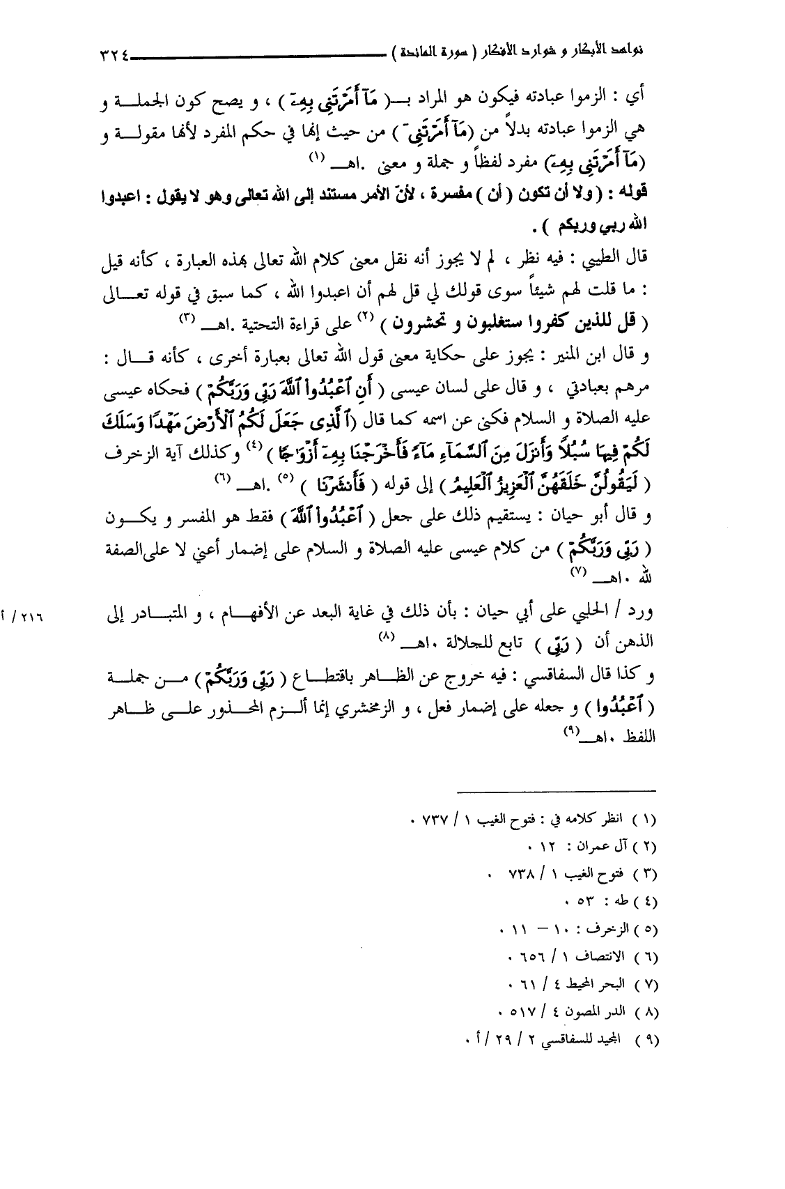 قوله: (ولا أن تكون (أن) مفسرة، لأنَّ الأمر مستند إلى الله تعالى وهو لا يقول: اعبدوا الله ربى وربكم).