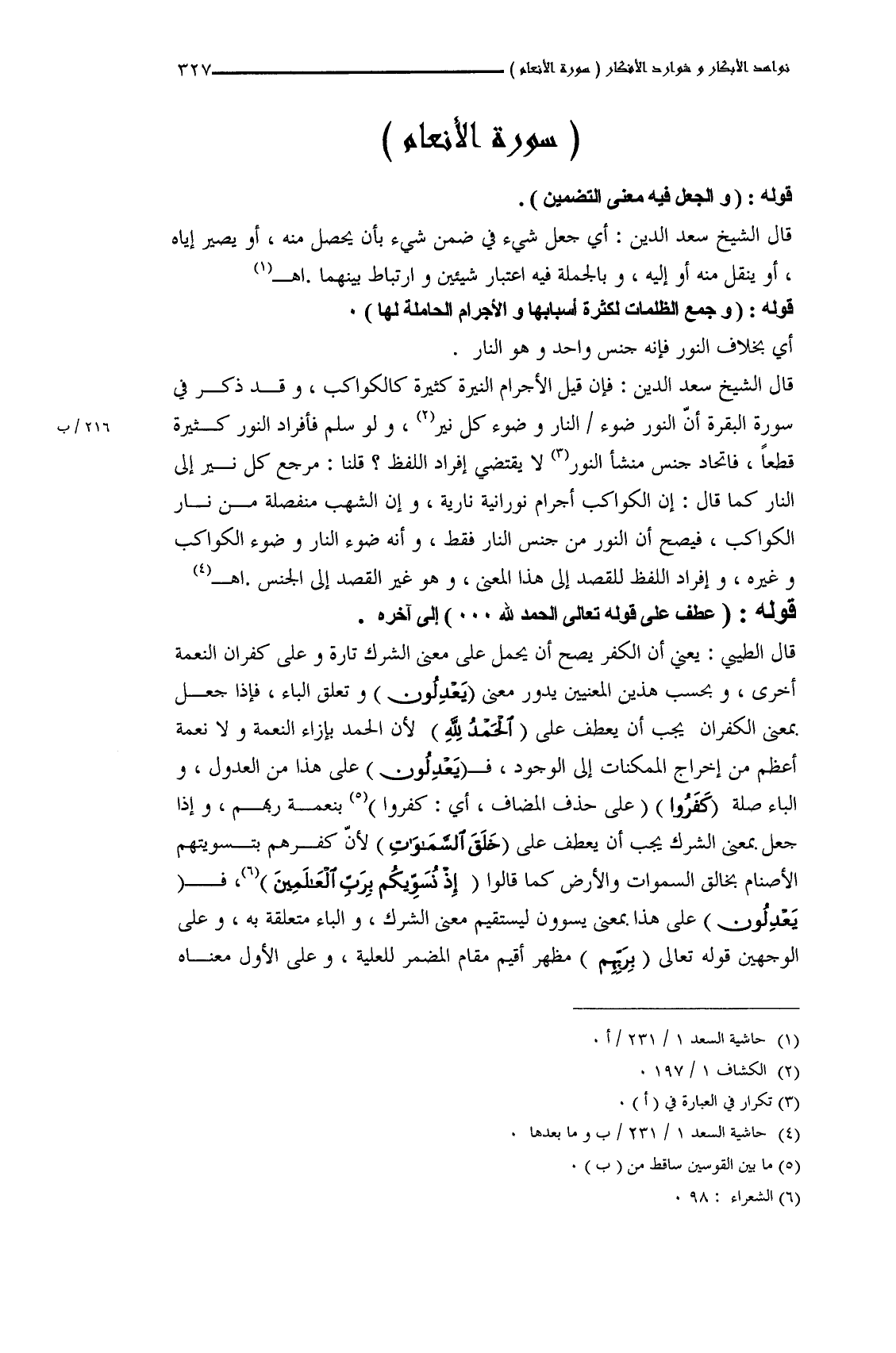 قال الشيخ سعد الدين: فإن قيل الأجرام النيرة كثيرة كالكواكب، وقد ذكر في سورة البقرة أنَّ النور ضوء النار وضوء كل نير، ولو سلم فأفراد النور كثيرة قطعاً، فاتحاد جنس منشأ النور لا يقتضي إفراد اللفظ؟ قلنا: مرجع كل نير إلى النار كما قال: إن الكواكب أجرام نورانية نارية، وإن الشهب منفصلة من نار الكواكب، فيصح أن النور من جنس النار فقط، وأنه ضوء النار وضوء الكواكب وغيره، وإفراد اللفظ للقصد إلى هذا المعنى، وهو غير القصد إلى الجنس. اهـ