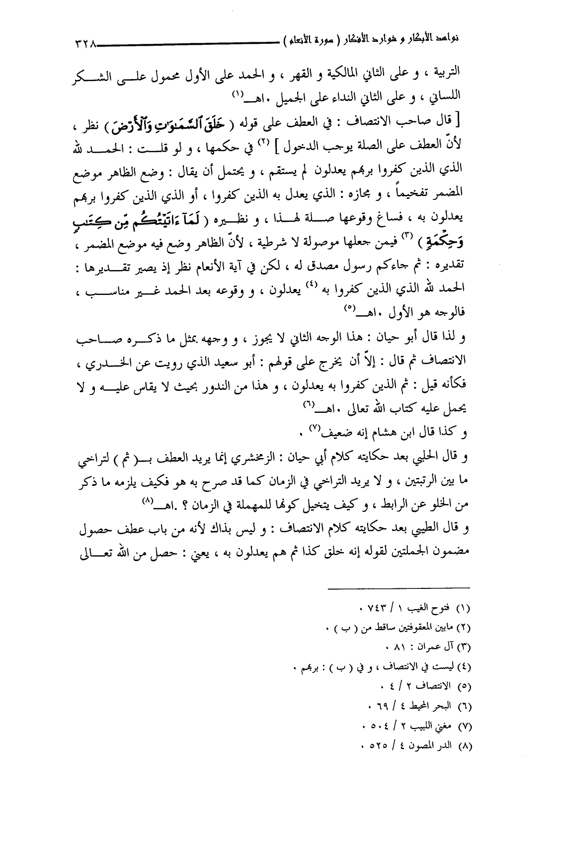 ًقال صاحب الانتصاف: في العطف على قوله (خَلَقَ السَّمَاوَاتِ وَالْأَرْضَ) نظر، لأنَّ العطف على الصلة يوجب الدخول في حكمها، ولو قلت: الحمد لله الذي الذين كفروا بربهم يعدلون لم يستقم، ويحتمل أن يقال: وضع الظاهر موضع المضمر تفخيماً، ومجازه: الذي يعدل به الذين كفروا، أو الذي الذين كفروا بربهم يعدلون به، فساغ وقوعها صلة لهذا، ونظيره (لَمَا آتَيْتُكُمْ مِنْ كِتَابٍ وَحِكْمَةٍ) فيمن جعلها موصولة لا شرطية، لأنَّ الظاهر وضع فيه موضع المضمر، تقديره: ثم جاءكم رسول مصدق له، لكن في آية الأنعام نظر إذ يصير تقديرها: الحمد لله الذي الذين كفروا به يعدلون، ووقوعه بعد الحمد غير مناسب، فالوجه هو الأول. اهـ