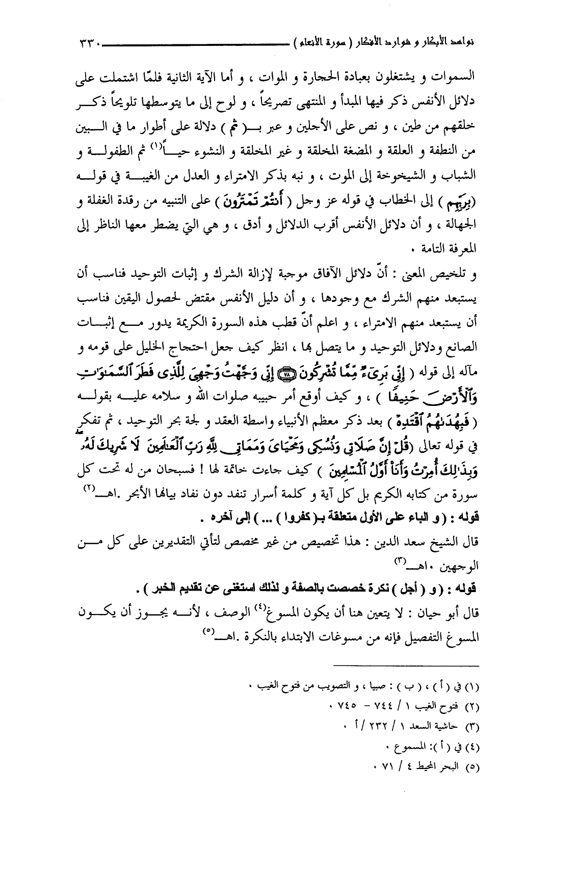 وتلخيص المعنى: أنَّ دلائل الآفاق موجبة لإزالة الشرك وإثبات التوحيد فناسب أن يستبعد منهم الشرك مع وجودها، وأن دليل الأنفس مقتض لحصول اليقين فناسب أن يستبعد منهم الامتراء، واعلم أنَّ قطب هذه السورة الكريمة يدور مع إثبات الصانع ودلائل التوحيد وما يتصل بها، انظر كيف جعل احتجاج الخليل على قومه ومآله إلى قوله (إِنِّي بَرِيءٌ مِمَّا تُشْرِكُونَ (78) إِنِّي وَجَّهْتُ وَجْهِيَ لِلَّذِي فَطَرَ السَّمَاوَاتِ وَالْأَرْضَ حَنِيفًا)، وكيف أوقع أمر حبيبه صلوات الله وسلامه عليه بقوله (فَبِهُدَاهُمُ اقْتَدِهْ) بعد ذكر معظم الأنبياء واسطة العقد ولجة بحر التوحيد، ثم تفكر في قوله تعالى (قُلْ إِنَّ صَلاتِي وَنُسُكِي وَمَحْيَايَ وَمَمَاتِي لِلَّهِ رَبِّ الْعَالَمِينَ (162) لا شَرِيكَ لَهُ وَبِذَلِكَ أُمِرْتُ وَأَنَا أَوَّلُ الْمُسْلِمِينَ) كيف جاءت خاتمة لها! فسبحان من له تحت كل سورة من كتابه الكريم بل كل آية وكلمة أسرار تنفد دون نفاد بيانها الأبحر. اهـ