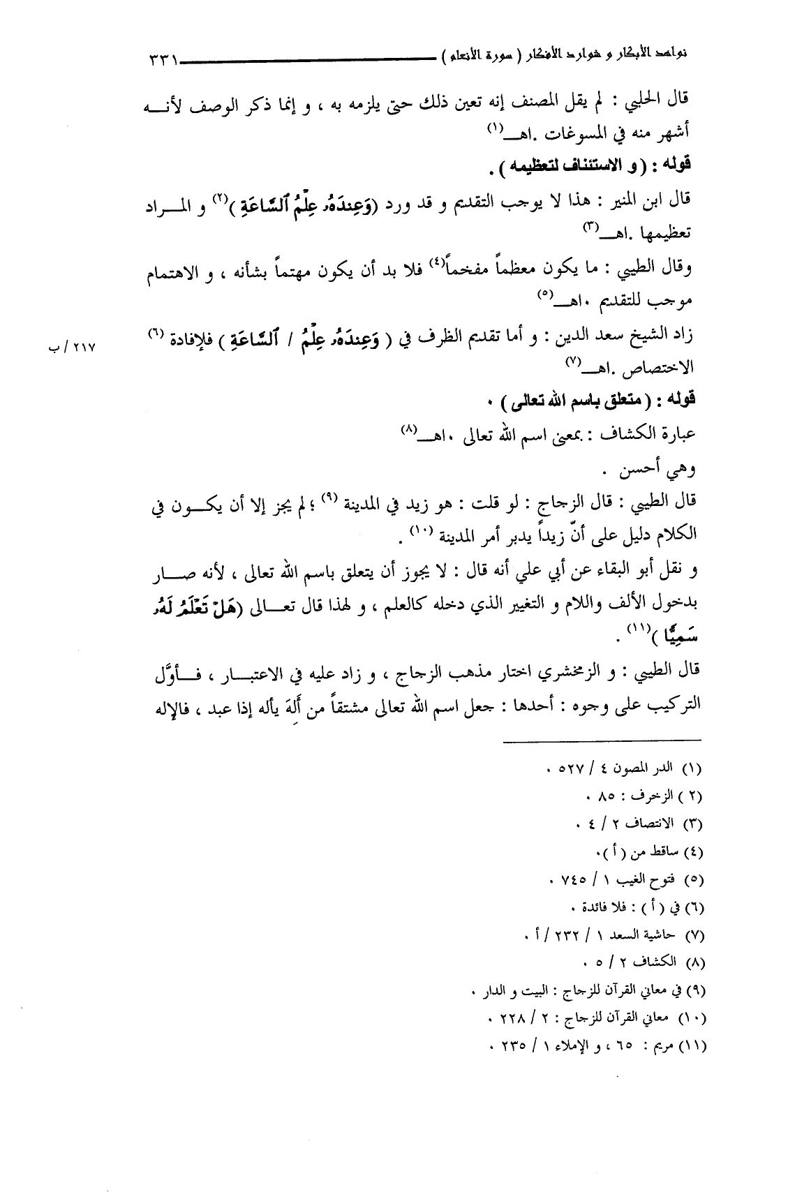 قال ابن المنير: هذا لا يوجب التقديم وقد ورد (وَعِنْدَهُ عِلْمُ السَّاعَةِ) والمراد تعظيمها. اهـ