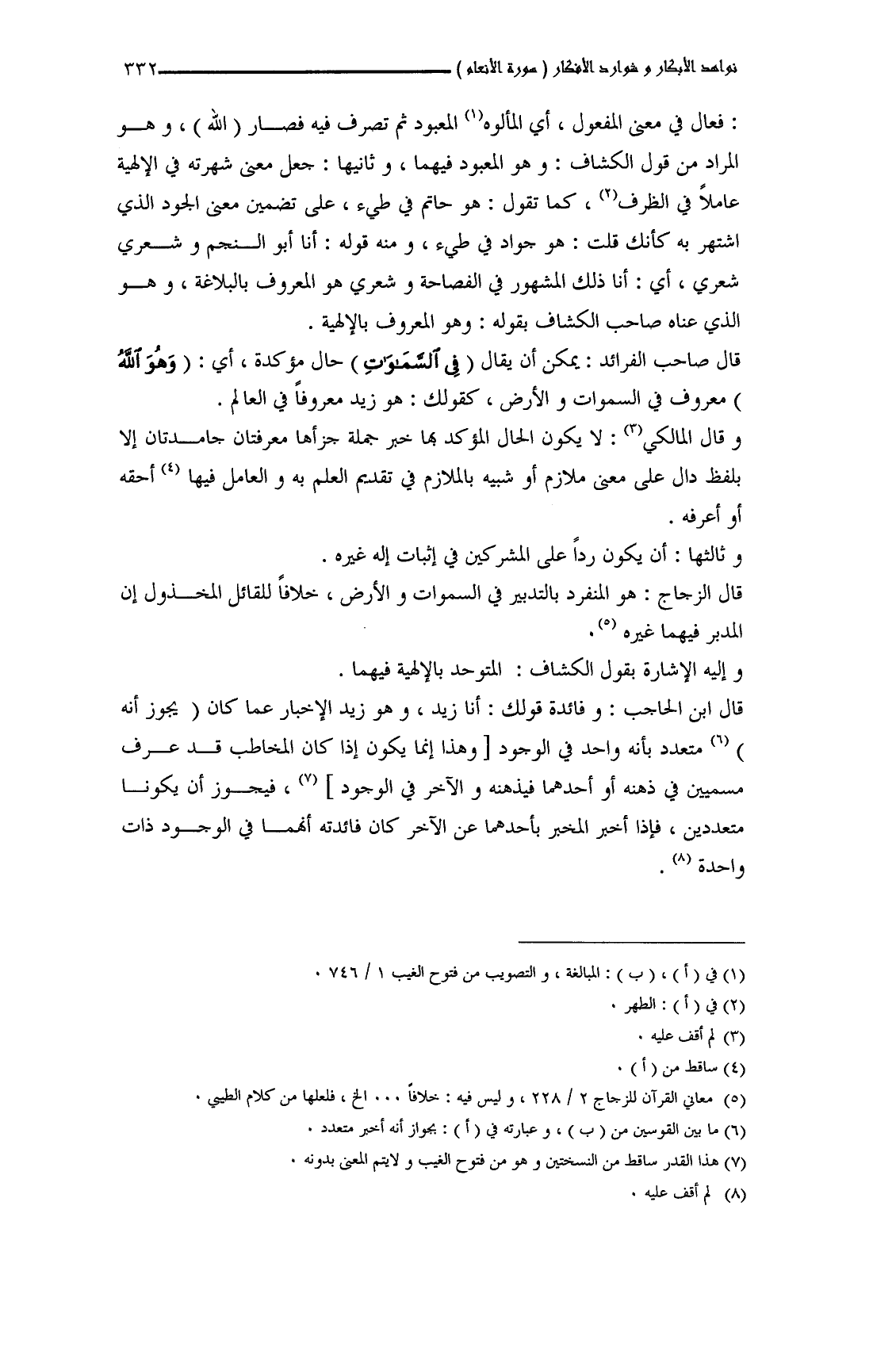 : فعال في معنى المفعول، أي المألوه المعبود ثم تصرف فيه فصار (الله)، وهو المراد من قول الكشاف: وهو المعبود فيهما، وثانيها: جعل معنى شهرته في الإلهية عاملاً في الظرف، كما تقول: هو حاتم في طيء، على تضمين معنى الجود الذي اشتهر به كأنك قلت: هو جواد في طىء، ومنه قوله: أنا أبو النجم وشعري شعري، أي: أنا ذلك المشهور في الفصاحة وشعري هو المعروف بالبلاغة، وهو الذي عناه صاحب الكشاف بقوله: وهو المعروف بالإلهية.