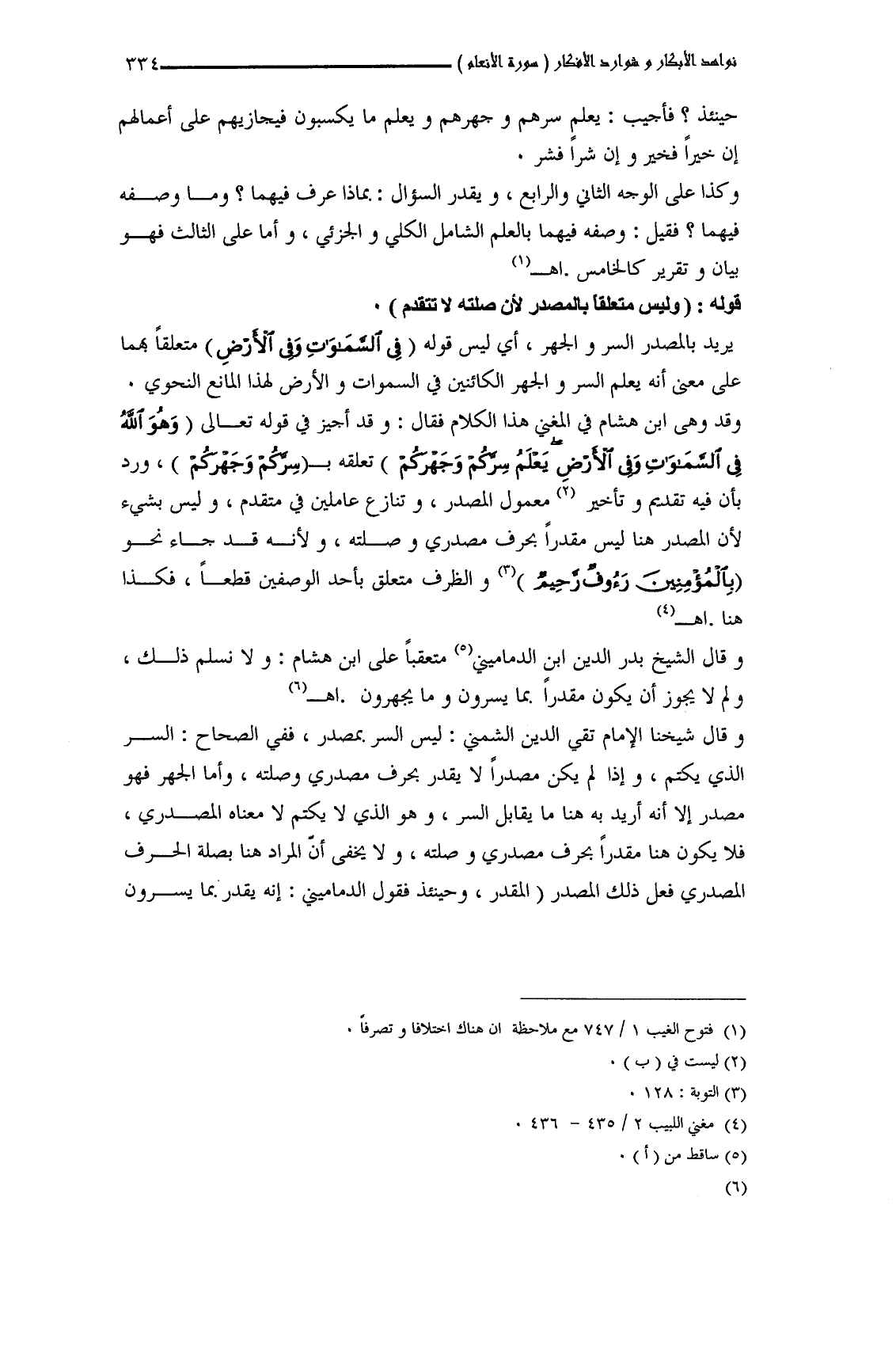 وقال شيخنا الإمام تقي الدين الشمني: ليس السر بمصدر، ففي الصحاح: السر الذي يكتم، وإذا لم يكن مصدراً لا يقدر بحرف مصدري وصلته، وأما الجهر فهو مصدر إلا أنه أريد به هنا ما يقابل السر، وهو الذي لا يكتم لا معناه المصدري، فلا يكون هنا مقدراً بحرف مصدري وصلته، ولا يخفى أنَّ المراد هنا بصلة الحرف المصدري فعل ذلك المصدر المقدر، وحينئذ فقول الدماميني: إنه يقدر بما يسرون