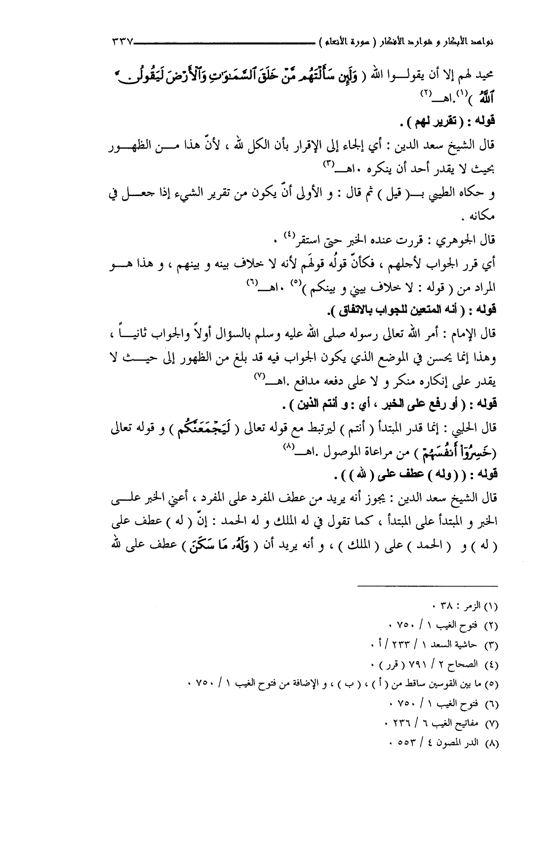 لا محيد لهم إلا أن يقولوا الله (وَلَئِنْ سَأَلْتَهُمْ مَنْ خَلَقَ السَّمَاوَاتِ وَالْأَرْضَ لَيَقُولُنَّ اللهُ). اهـ