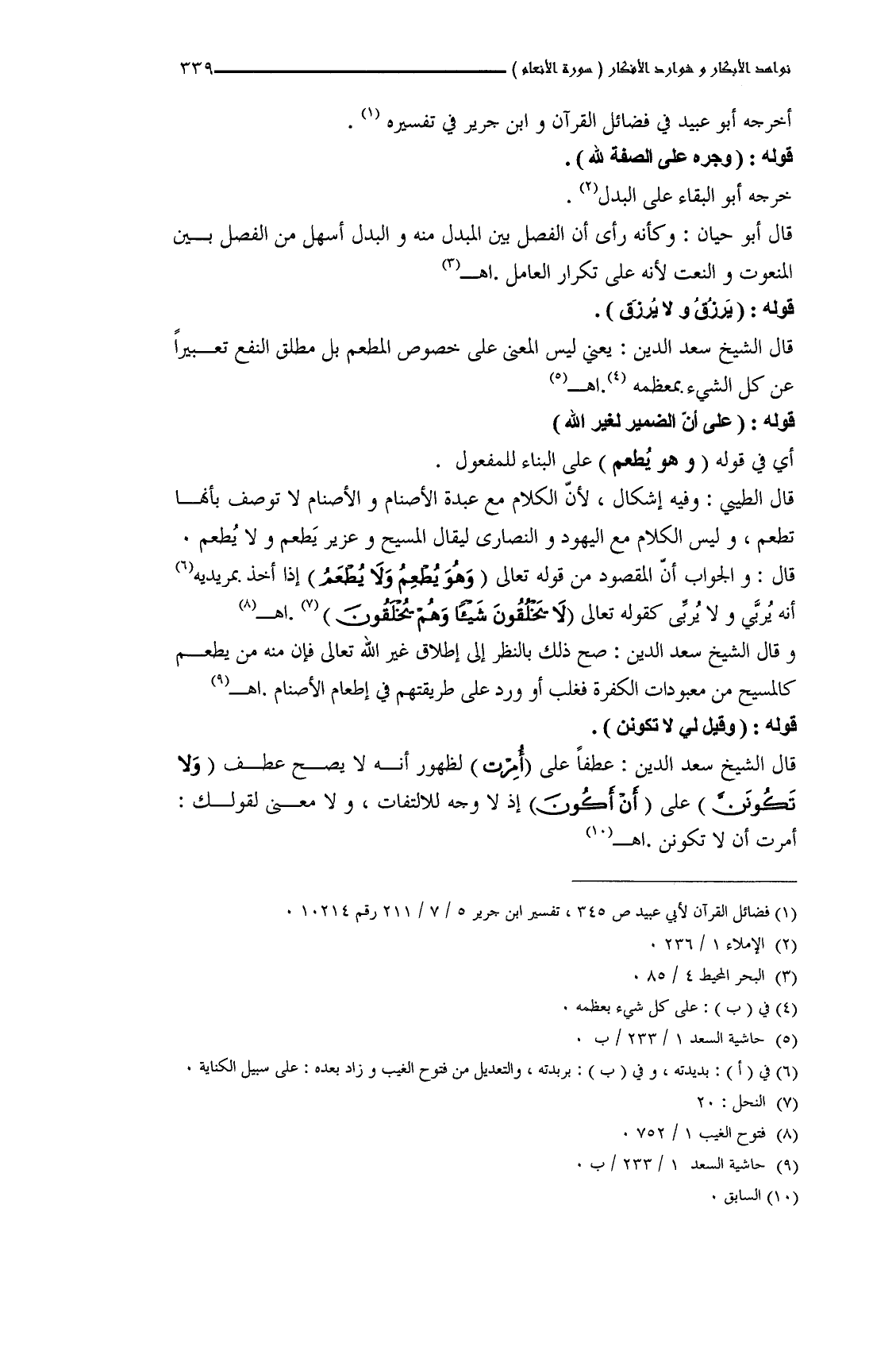 قال: والجواب أنَّ المقصود من قوله تعالى (وَهُوَ يُطْعِمُ وَلا يُطْعَمُ) إذا أخذ بمريديه أنه يُربَّى ولا يُربِّى كقوله تعالى (لا يَخْلُقُونَ شَيْئًا وَهُمْ يُخْلَقُونَ). اهـ