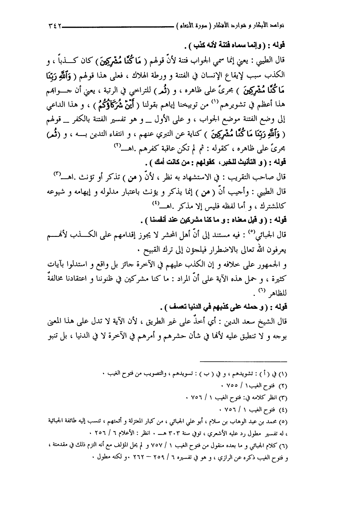 قال الطيبي: يعني إنما سمي الجواب فتنة لأنَّ قولهم (مَا كُنَّا مُشْرِكِينَ) كان كذباً، والكذب سبب لإيقاع الإنسان في الفتنة وورطة الهلاك، فعلى هذا قولهم (وَاللهِ رَبِّنَا مَا كُنَّا مُشْرِكِينَ) مجرىً على ظاهره، و (ثُمَّ) للتراخي في الرتبة، يعني أن جوابهم هذا أعظم في تشويرهم من توبيخنا إياهم بقولنا (أَيْنَ شُرَكَاؤُكُمُ)، وهذا الداعي إلى وضع الفتنة موضع الجواب، وعلى الأول -وهو تفسير الفتنة بالكفر- قولهم (وَاللهِ رَبِّنَا مَا كُنَّا مُشْرِكِينَ) كناية عن التبري عنهم، وانتفاء التدين به، و (ثُمَّ) مجرىً على ظاهره، كقوله: ثم لم تكن عاقبة كفرهم. اهـ