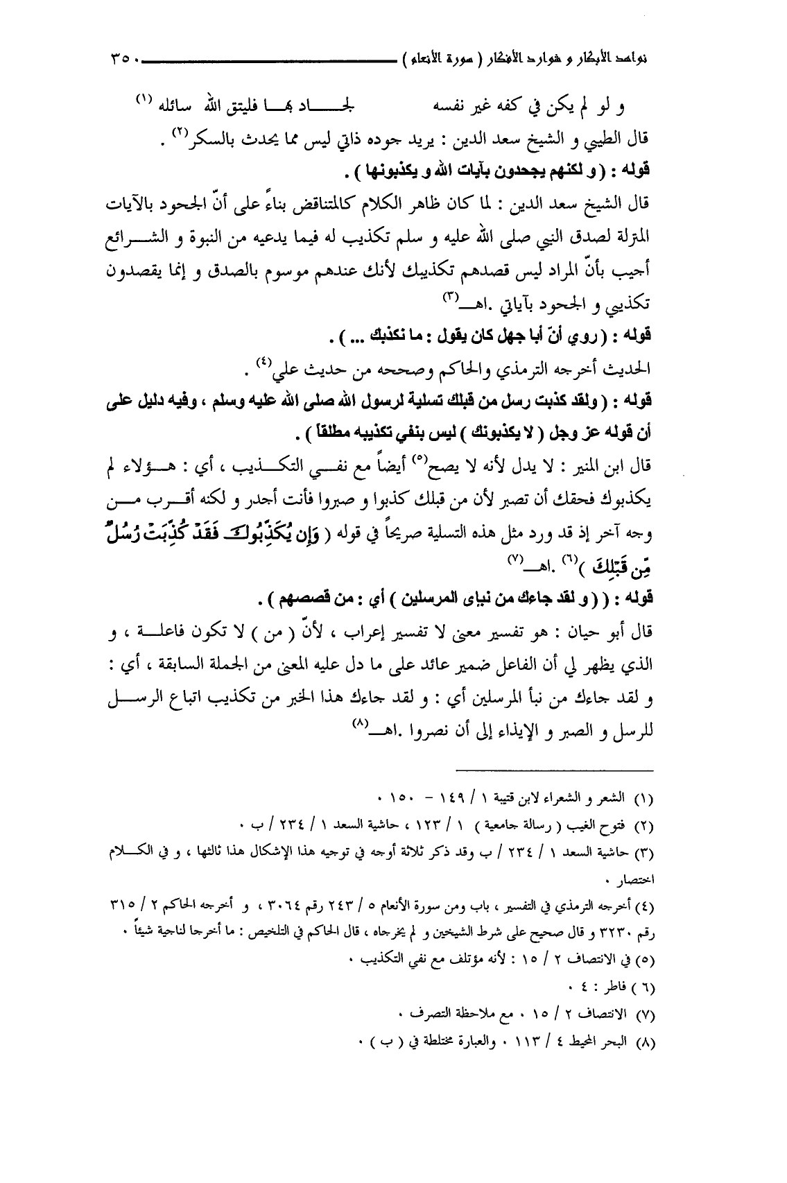 قال الشيخ سعد الدين: لما كان ظاهر الكلام كالمتناقض بناءً على أنَّ الجحود بالآيات المنزلة لصدق النبي صلى الله عليه وسلم تكذيب له فيما يدعيه من النبوة والشرائع أجيب بأنَّ المراد ليس قصدهم تكذيبك لأنك عندهم موسوم بالصدق وإنما يقصدون تكذيبي والجحود بآياتي. اهـ