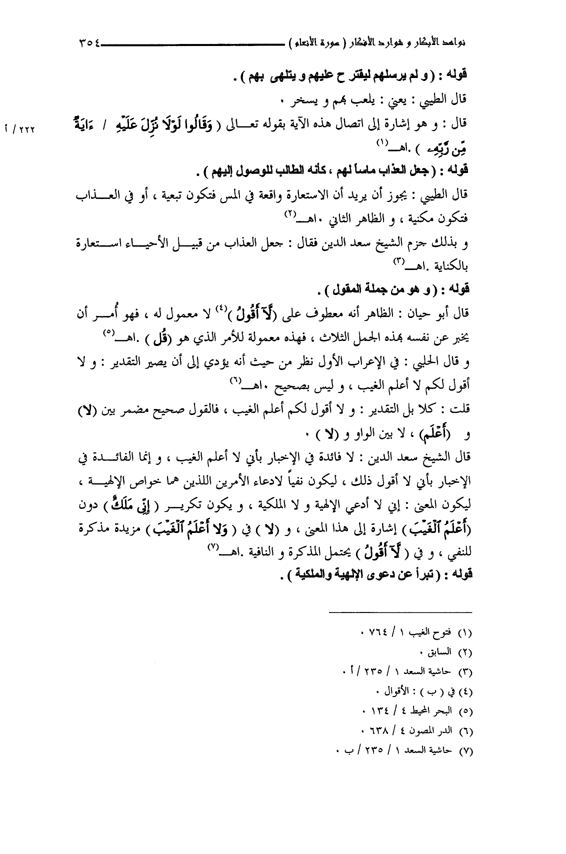 قال الشيخ سعد الدين: لا فائدة في الإخبار بأني لا أعلم الغيب، وإنما الفائدة في الإخبار بأني لا أقول ذلك، ليكون نفياً لادعاء الأمرين اللذين هما خواص الإلهية، ليكون المعنى: إني لا أدعى الإلهية ولا الملكية، ويكون تكرير (إِنِّي مَلَكٌ) دون (لا أَعْلَمُ) إشارة إلى هذا المعنى، و (لا) في (وَلا أَعْلَمُ الْغَيْبَ) مزيدة مذكرة للنفي، وفي (لا أَقُولُ) يحتمل المذكرة والنافية. اهـ