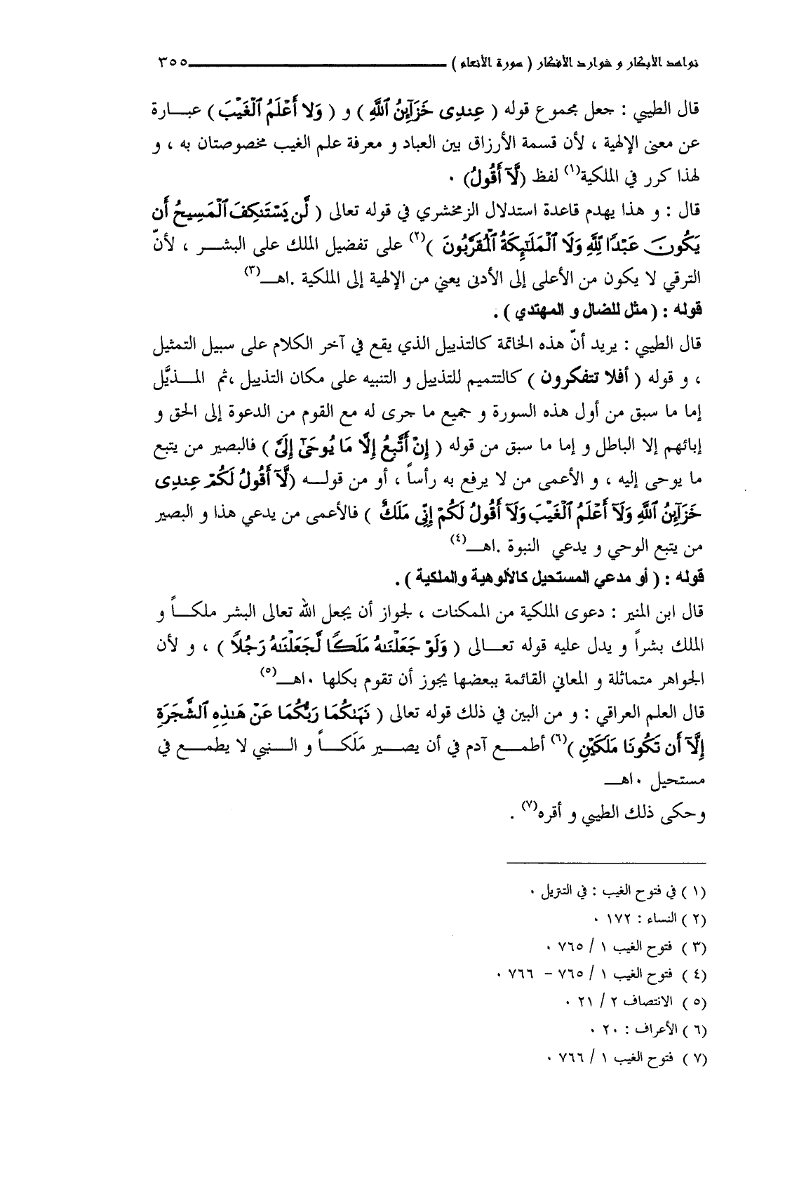 قال الطَّيبي: جعل مجموع قوله (عِنْدِي خَزَائِنُ اللهِ) و (وَلا أَعْلَمُ الْغَيْبَ) عبارة عن معنى الإلهية، لأن قسمة الأرزاق بين العباد ومعرفة علم الغيب مخصوصتان به، ولهذا كرر في الملكية لفظ (لا أَقُولُ).