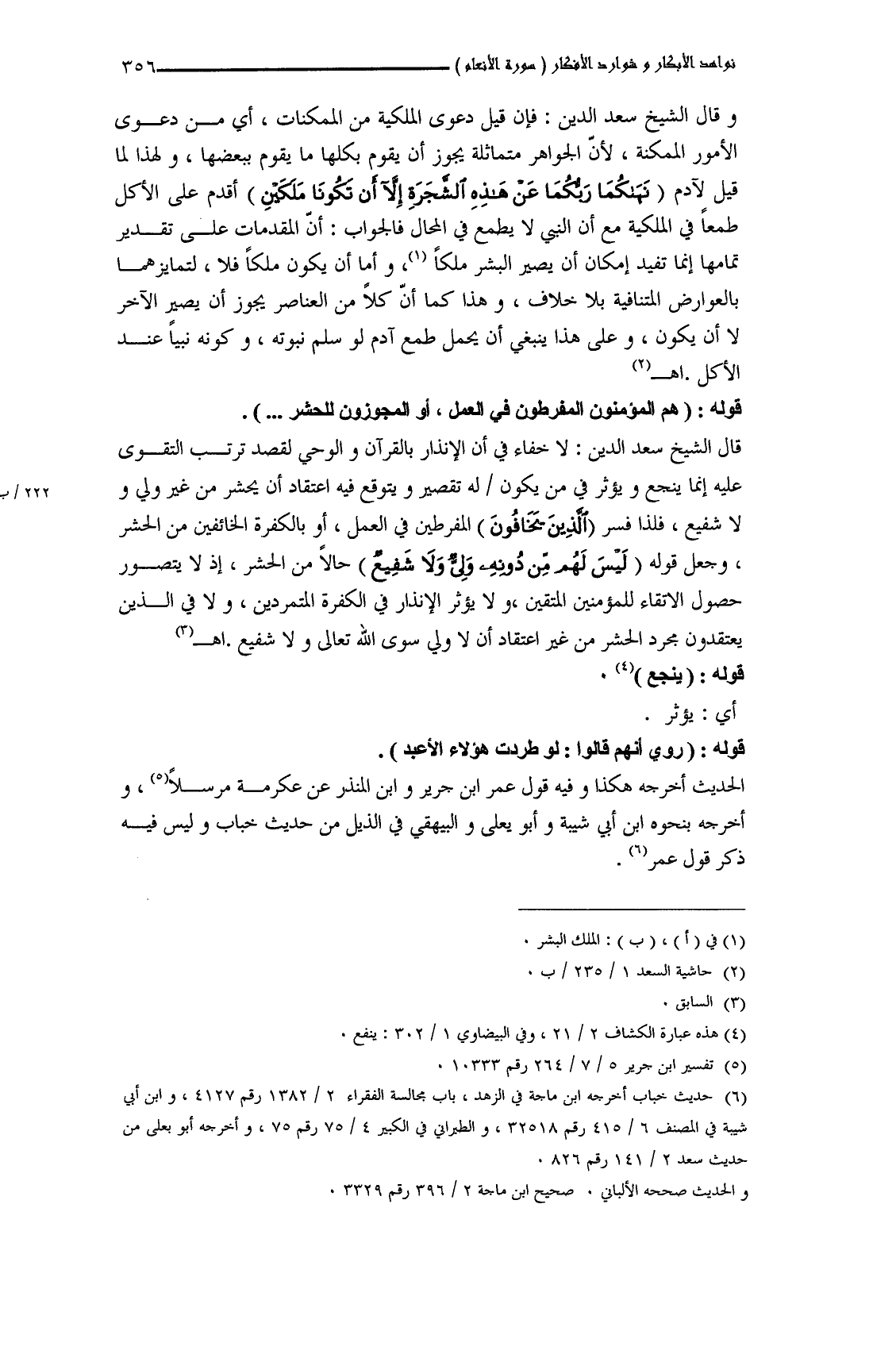 وقال الشيخ سعد الدين: فإن قيل دعوى الملكية من الممكنات، أي من دعوى الأمور الممكنة، لأنَّ الجواهر متماثلة يجوز أن يقوم بكلها ما يقوم ببعضها، ولهذا لما قيل لآدم (مَا نَهَاكُمَا رَبُّكُمَا عَنْ هَذِهِ الشَّجَرَةِ إِلاّ أَنْ تَكُونَا مَلَكَيْنِ) أقدم على الأكل طمعاً في الملكية مع أن النبي لا يطمع في المحال فالجواب: أنَّ المقدمات على تقدير تمامها إنما تفيد إمكان أن يصير البشر ملكاً، وأما أن يكون ملكاً فلا، لتمايزهما بالعوارض المتنافية بلا خلاف، وهذا كما أنَّ كلاً من العناصر يجوز أن يصير الآخر لا أن يكون، وعلى هذا ينبغي أن يحمل طمع آدم لو سلم نبوته، وكونه نبياً عند الأكل. اهـ