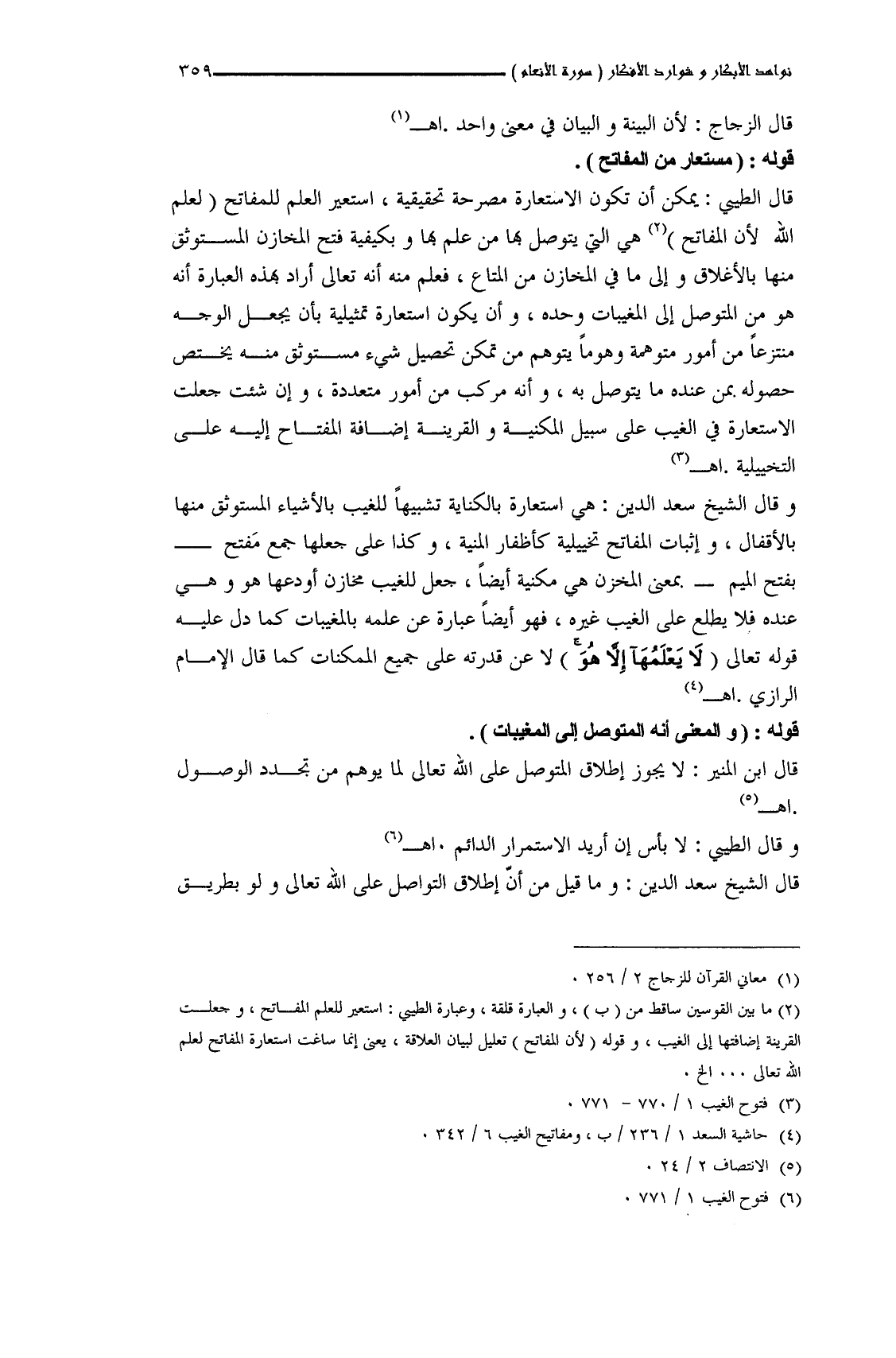 وقال الشيخ سعد الدين: هي استعارة بالكناية تشبيهاً للغيب بالأشياء المستوثق منها بالأقفال، وإثبات المفاتح تخييلية كأظفار المنية، وكذا على جعلها جمع مَفتح -بفتح الميم- بمعنى المخزن هي مكنية أيضاً، جعل للغيب مخازن أودعها هو وهي عنده فلا يطلع على الغيب غيره، فهو أيضاً عبارة عن علمه بالمغيبات كما دل عليه قوله تعالى (لا يَعْلَمُهَا إِلاّ هُوَ) لا عن قدرته على جميع الممكنات كما قال الإمام الرازي. اهـ