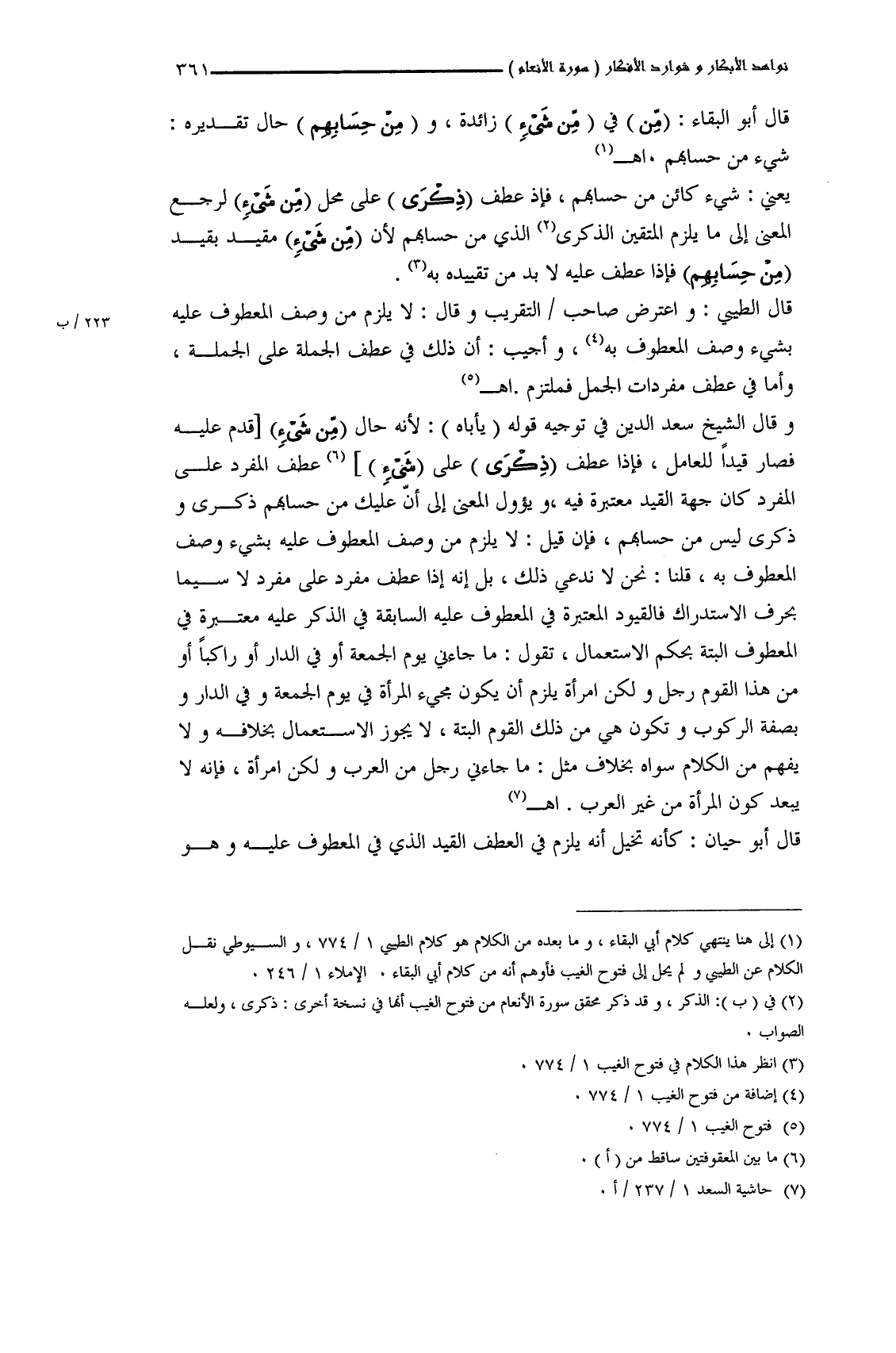 وقال الشيخ سعد الدين في توجيه قوله (يأباه): لأنه حال (من شيءٍ) قدم عليه فصار قيداً للعامل، فإذا عطف (ذكرَى) على (شيءٍ) عطف المفرد على المفرد كان جهة القيد معتبرة فيه، ويؤول المعنى إلى أنَّ عَليك من حسابهم ذكرى وذكرى ليس من حسابهم، فإن قيل: لا يلزم من وصف المعطوف عليه بشيء وصف المعطوف به، قلنا: نحن لا ندعي ذلك، بل إنه إذا عطف مفرد على مفرد لا سيما بحرف الاستدراك فالقيود المعتبرة في المعطوف عليه السابقة في الذكر عليه معتبرة في المعطوف ألبتَّة بحكم الاستعمال، تقول: ما جاءني يوم الجمعة أو في الدار أو راكباً أو من هذا القوم رجل ولكن امرأة يلزم أن يكون مجيء المرأة في يوم الجمعة وفي الدار وبصفة الركوب وتكون هي من ذلك القوم ألبتَّة، لا يجوز الاستعمال بخلافه ولا يفهم من الكلام سواه بخلاف مثل: ما جاءني رجل من العرب ولكن امرأة، فإنه لا يبعد كون المرأة من غير العرب. اهـ