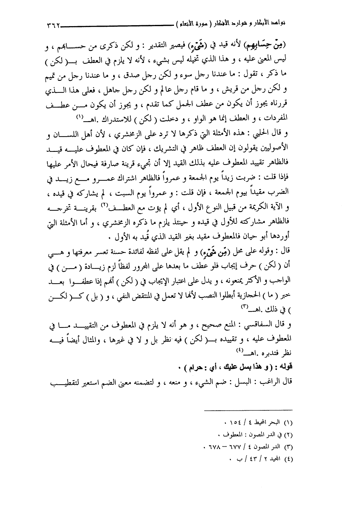 وقال الحلبي: هذه الأمثلة التي ذكرها لا ترد على الزمخشري، لأن أهل اللسان والأصوليين يقولون إن العطف ظاهر في التشريك، فإن كان في المعطوف عليه قيد فالظاهر تقييد المعطوف عليه بذلك القيد إلا أن تجيء قرينة صارفة فيحال الأمر عليها فإذا قلت: ضربت زيداً يوم الجمعة وعمرواً فالظاهر اشتراك عمرو مع زيد في الضرب مقيداً بيوم الجمعة، فإن قلت: وعمرواً يوم السبت، لم يشاركه في قيده، والآية الكريمة من قبيل النوع الأول، أي لم يؤت مع العطف بقرينة تخرجه فالظاهر مشاركته للأول في قيده وحينئذ يلزم ما ذكره الزمخشري، وأما الأمثلة التي أوردها أبو حيان فالمعطوف مقيد بغير القيد الذي قُيد به الأول.