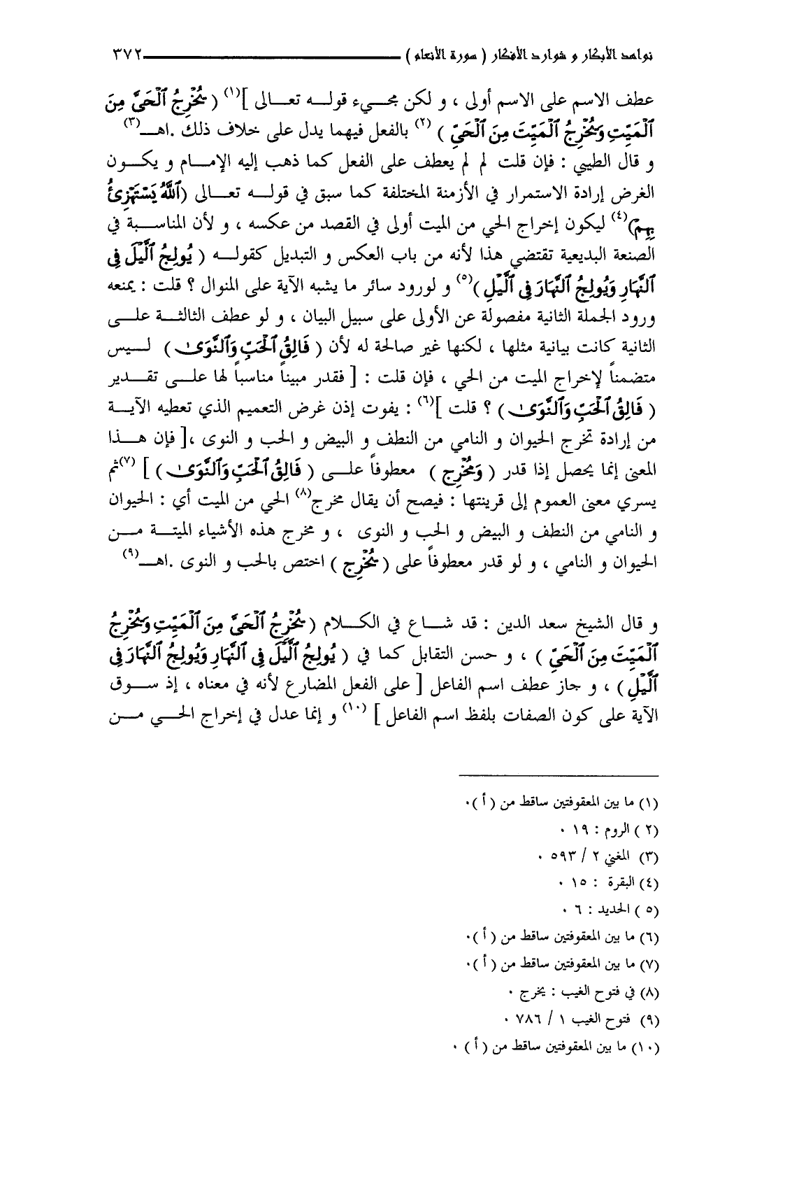وقال الشيخ سعد الدين: قد شاع في الكلام (يُخْرِجُ الْحَيَّ مِنَ الْمَيِّتِ وَيُخْرِجُ الْمَيِّتَ مِنَ الْحَيِّ)، وحسن التقابل كما في (يُولِجُ اللَّيْلَ فِي النَّهَارِ وَيُولِجُ النَّهَارَ فِي اللَّيْلِ)، وجاز عطف اسم الفاعل على الفعل المضارع لأنه في معناه، إذ سوق الآية على كون الصفات بلفظ اسم الفاعل وإنما عدل في إخراج الحي من