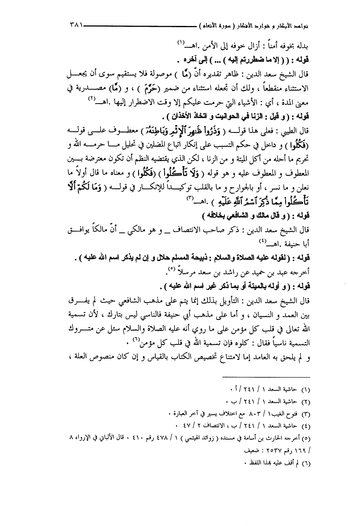 قال الشيخ سعد الدين: التأويل بذلك إنما يتم على مذهب الشافعي حيث لم يفرق بين العمد والنسيان، وأما على مذهب أبي حنيفة فالناسي ليس بتارك، لأن تسمية الله تعالى في قلب كل مؤمن على ما روي أنه عليه الصلاة والسلام سئل عن متروك التسمية ناسياً فقال: كلوه فإن تسمية الله في قلب كل مؤمن.