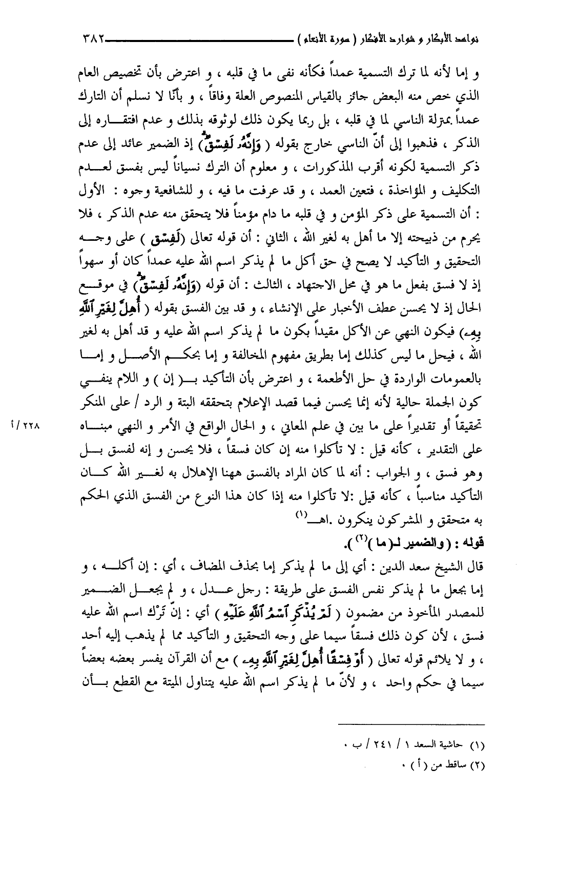 وإما لأنه لما ترك التسمية عمداً فكأنه نفى ما في قلبه، واعترض بأن تخصيص العام الذي خص منه البعض جائز بالقياس المنصوص العلة وفاقاً، وبأننا لا نسلم أن التارك عمداً بمنزلة الناسي لما في قلبه، بل ربما يكون ذلك لوثوقه بذلك وعدم افتقاره إلى الذكر، فذهبوا إلى أنَّ الناسي خارج بقوله (وَإِنَّهُ لَفِسْقٌ) إذ الضمير عائد إلى عدم ذكر التسمية لكونه أقرب المذكورات، ومعلوم أن الترك نسياناً ليس بفسق لعدم التكليف والمؤاخذة، فتعين العمد، وقد عرفت ما فيه، وللشافعية وجوه: الأول: أن التسمية على ذكر المؤمن وفي قلبه ما دام مؤمناً فلا يتحقق منه عدم الذكر، فلا يحرم من ذبيحته إلا ما أُهلَّ به لغير الله، الثاني: أن قوله تعالى (لَفِسْقٌ) على وجه التحقيق والتأكيد لا يصح في حق أكل ما لم يذكر اسم الله عليه عمداً كان أو سهواً
