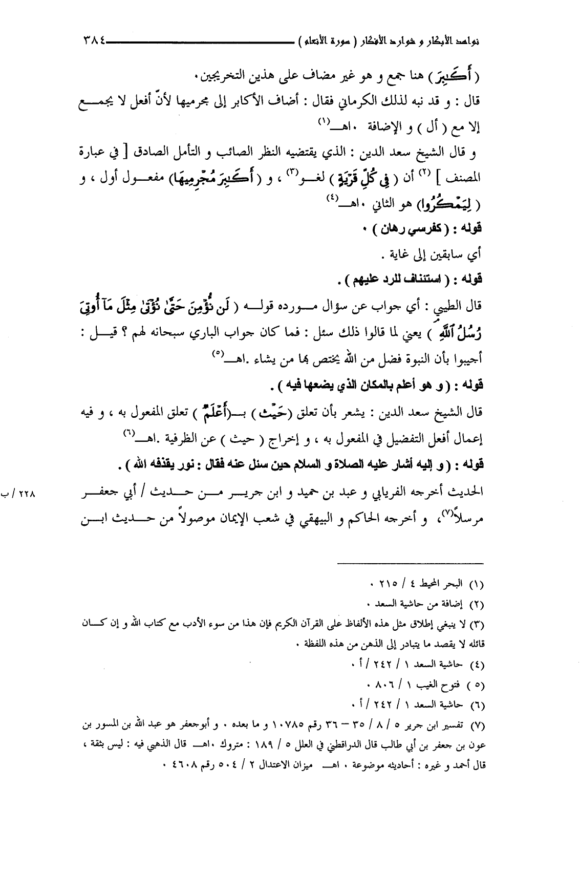 وقال الشيخ سعد الدين: الذي يقتضيه النظر الصائب والتأمل الصادق في عبارة المصنف أن (فِي كُلِّ قَرْيَةٍ) لغو، و (أَكَابِرَ مُجْرِمِيهَا) مفعول أول، و (لِيَمْكُرُوا) هو الثاني. اهـ