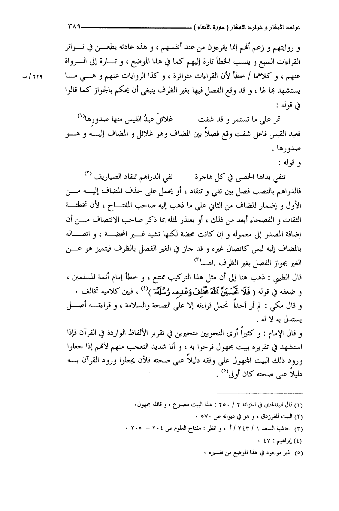 وروايتهم وزعم أنَّهم إنما يقرءون من عند أنفسهم، وهذه عادته يطعن في تواتر القراءات السبع وينسب الخطأ تارة إليهم كما في هذا الموضع، وتارة إلى الرواة عنهم، وكلاهما خطأ لأن القراءات متواترة، وكذا الروايات عنهم وهى ما يستشهد بها لها، وقد وقع الفصل فيها بغير الظرف ينبغي أن يحكم بالجواز كما قالوا في قوله:
