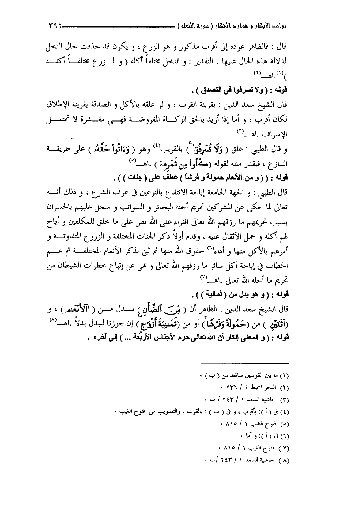 وقال الطَّيبي: علق (وَلا تُسْرِفُوا) بالقريب وهو (وَآتُوا حَقَّهُ) على طريقة التنازع، فيقدر مثله لقوله (كُلُوا مِنْ ثَمَرِهِ). اهـ