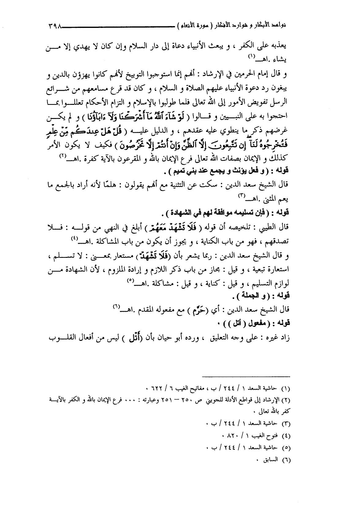 وقال إمام الحرمين في الإرشاد: أنَّهم إنما استوجبوا التوبيخ لأنهم كانوا يهزؤن بالدين ويبغون رد دعوة الأنبياء عليهم الصلاة والسلام، وكان قد قرع مسامعهم من شرائع الرسل تفويض الأمور إلى الله تعالى فلما طولبوا بالإسلام والتزام الأحكام تعللوا بما احتجوا به على النبيين وقالوا (لَوْ شَاءَ اللهُ مَا أَشْرَكْنَا وَلا آبَاؤُنَا) ولم يكن غرضهم ذكر ما ينطوي عليه عقدهم، والدليل عليه (قُلْ هَلْ عِنْدَكُمْ مِنْ عِلْمٍ فَتُخْرِجُوهُ لَنَا إِنْ تَتَّبِعُونَ إِلاّ الظَّنَّ وَإِنْ أَنْتُمْ إِلاّ تَخْرُصُونَ) فكيف لا يكون الأمر كذلك والإيمان بصفات الله تعالى فرع الإيمان بالله والمقرعون بالآية كفرة. اهـ