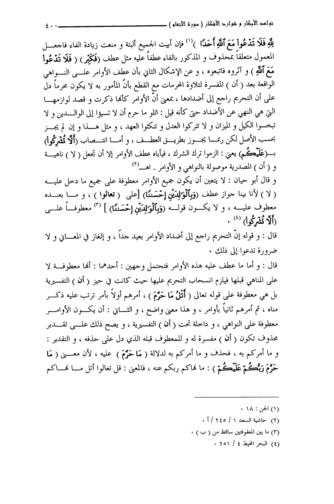 لِلَّهِ فَلا تَدْعُوا مَعَ اللهِ أَحَدًا) فإن أبيت الجميع ألبتة ومنعت زيادة الفاء فاجعل المعمول متعلقاً بمحذوف والمذكور بالفاء عطفاً عليه مثل عطف (فَكبِّر) (فَلا تَدْعُوا مَعَ اللهِ أَحَدًا) وآثروه فاتبعوه، وعن الإشكال الثاني بأن عطف الأوامر على النواهي الواقعة بعد (أن) المفسرة لتلاوة المحرمات مع القطع بأنَّ المأمور به لا يكون محرماً دل على أن التحريم راجع إلى أضدادها، بمعنى أن الأوامر كأنها ذكرت وقصد لوازمها التي هي النهي عن الأضداد حتى كأنه قيل: أتلو ما حرم أن لا تسيؤا إلى الوالدين ولا تبخسوا الكيل والميزان ولا تتركوا العدل وتنكثوا العهد، ومثل هذا وإن لم يجز بحسب الأصل لكن ربما يجوز بطريق العطف، وأما انتصاب (أَلاّ تُشْرِكُوا) بـ (عَلَيْكُمْ) يعني: الزموا ترك الشرك، فيأباه عطف الأوامر إلا أن تجعل (لا) ناهية