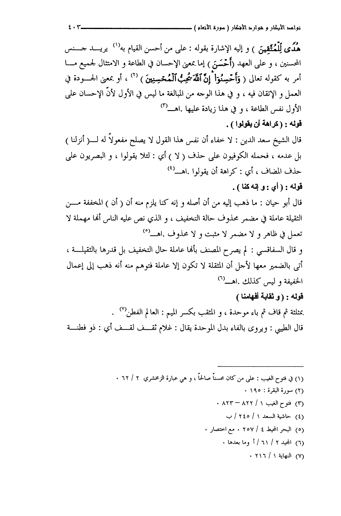 هُدًى لِلْمُتَّقِينَ) وإليه الإشارة بقوله: على من أحسن القيام به يريد جنس المحسنين، وعلى العهد (أَحْسَنَ) إما بمعنى الإحسان في الطاعة والامتثال لجميع ما أمر به كقوله تعالى (وَأَحْسِنُوا إِنَّ اللهَ يُحِبُّ الْمُحْسِنِينَ)، أو بمعنى الجودة في العمل والإتقان فيه، وفي هذا الوجه من المبالغة ما ليس في الأول لأنَّ الإحسان على الأول نفس الطاعة، وفي هذا زيادة عليها. اهـ