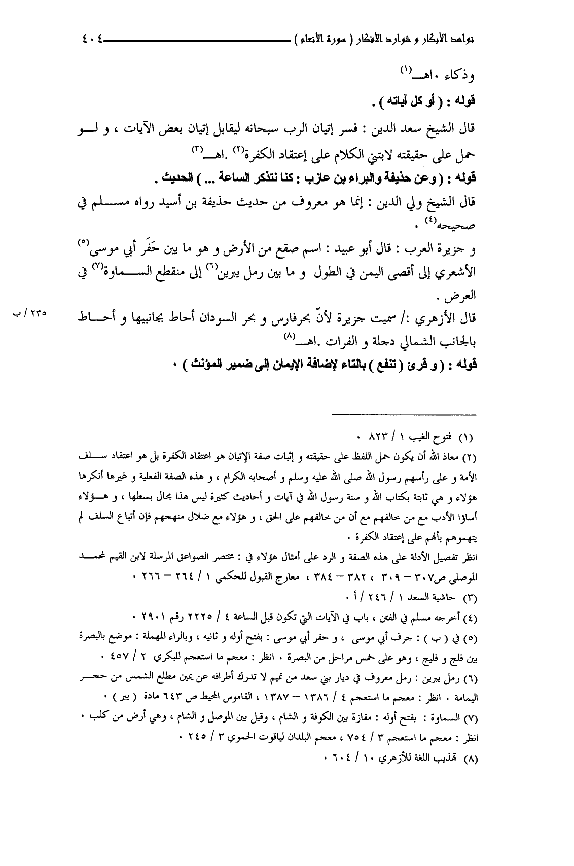 قوله: (وقرئ (تنفع) بالتاء لإضافة الإيمان إلى ضمير المؤنث).