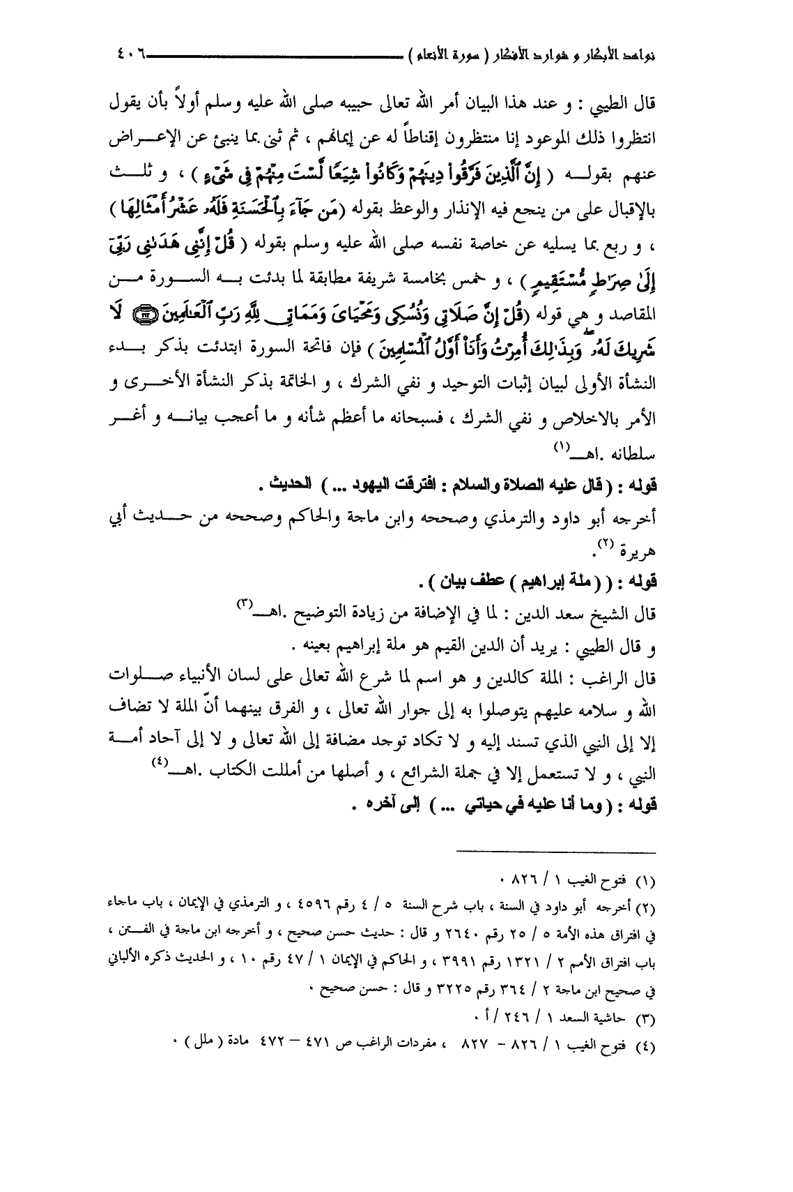 قال الطَّيبي: وعند هذا البيان أمر الله تعالى حبيبه صلى الله عليه وسلم أولاً بأن يقول انتظروا ذلك الموعود إنا منتظرون إقناطاً له عن إيمانهم، ثم ثنى بما ينبئ عن الإعراض عنهم بقوله (إِنَّ الَّذِينَ فَرَّقُوا دِينَهُمْ وَكَانُوا شِيَعًا لَسْتَ مِنْهُمْ فِي شَيْءٍ)، وثلث بالإقبال على من ينجع فيه الإنذار والوعظ بقوله (مَنْ جَاءَ بِالْحَسَنَةِ فَلَهُ عَشْرُ أَمْثَالِهَا)، وربع بما يسليه عن خاصة نفسه صلى الله عليه وسلم بقوله (قُلْ إِنَّنِي هَدَانِي رَبِّي إِلَى صِرَاطٍ مُسْتَقِيمٍ)، وخمس بخامسة شريفة مطابقة لما بدئت به السورة من المقاصد وهى قوله (قُلْ إِنَّ صَلاتِي وَنُسُكِي وَمَحْيَايَ وَمَمَاتِي لِلَّهِ رَبِّ الْعَالَمِينَ (162) لا شَرِيكَ لَهُ وَبِذَلِكَ أُمِرْتُ وَأَنَا أَوَّلُ الْمُسْلِمِينَ). فإن فاتحة السورة ابتدئت بذكر بدء النشأة الأولى لبيان إثبات التوحيد ونفي الشرك، والخاتمة بذكر النشأة الأخرى والأمر بالاخلاص ونفي الشرك، فسبحانه ما أعظم شأنه وما أعجب بيانه وأعز سلطانه. اهـ