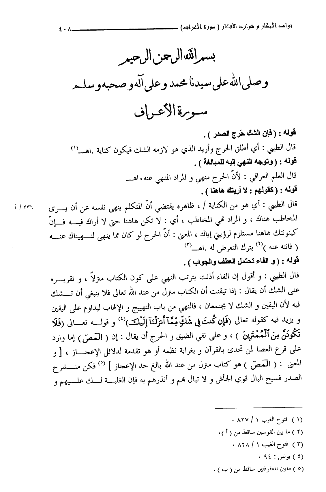 قال الطَّيبي: وأقول إن الفاء أذنت بترتب النهي على كون الكتاب منزلاً، وتقريره على الشك أن يقال: إذا تيقنت أن الكتاب منزل من عند الله تعالى فلا ينبغي أن تشك فيه لأن اليقين والشك لا يجتمعان، فالنهي من باب التهييج والإلهاب ليداوم على اليقين ويزيد فيه كقوله تعالى (فَإِنْ كُنْتَ فِي شَكٍّ مِمَّا أَنْزَلْنَا إِلَيْكَ) وقوله تعالى (فَلا تَكُونَنَّ مِنَ الْمُمْتَرِينَ)، وعلى نفي الضيق والحرج أن يقال: إن (المص) إما وارد على قرع العصا لمن تحدى بالقرآن وبغرابة نظمه أو هو تقدمة لدلائل الإعجاز، والمعنى: (المص) هو كتاب منزل من عند الله بالغ حد الإعجاز فكن منشرح الصدر فسيح البال قوي الجأش ولا تبال بهم وأنذرهم به فإن الغلبة لك عليهم