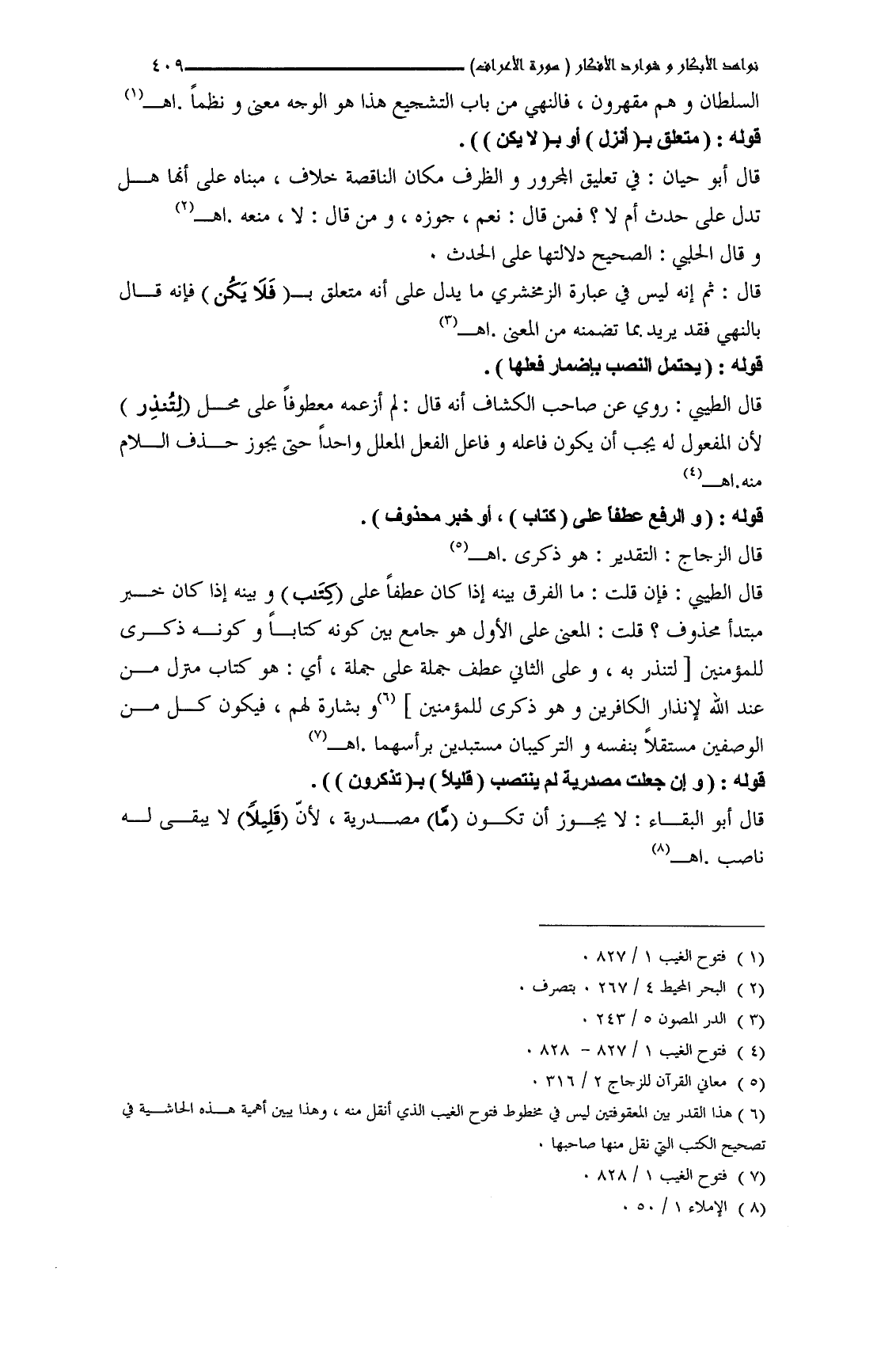 قوله: (متعلق بـ (أُنْزِلَ) أو بـ (لا يَكُنْ)).