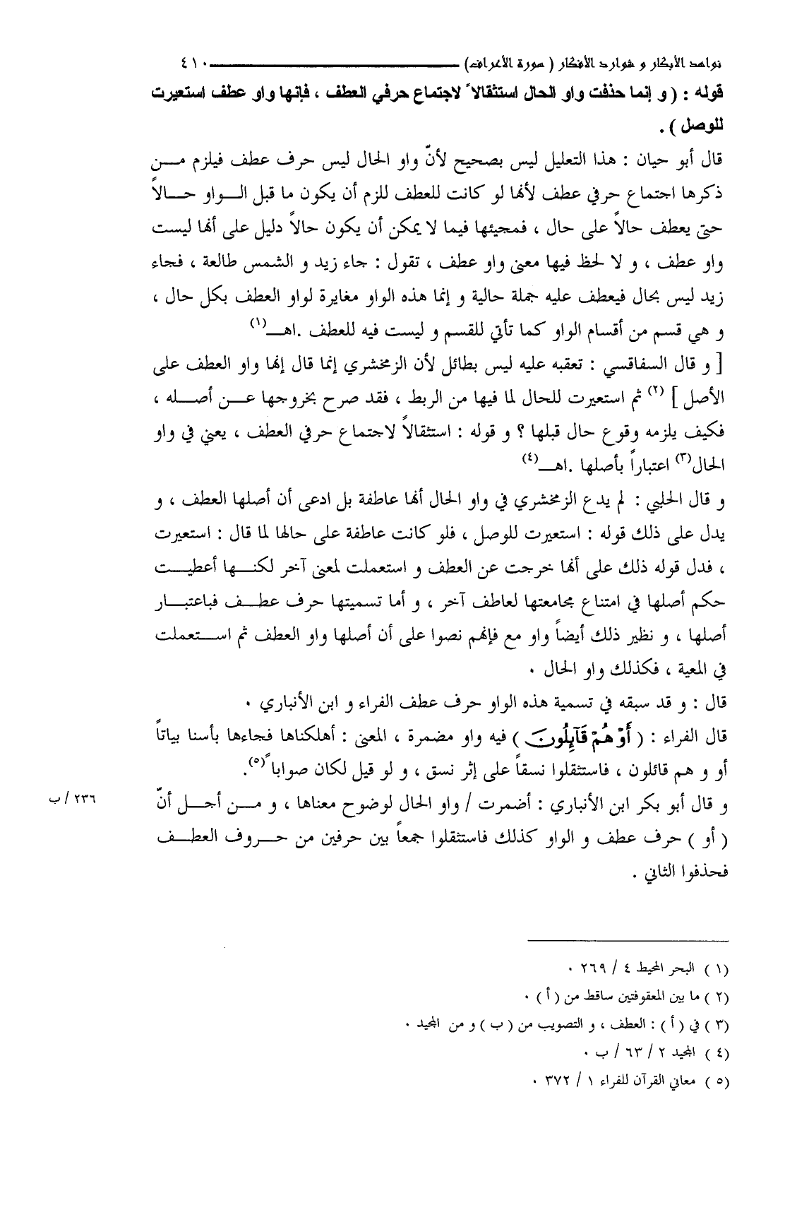 ًوقال السفاقسي: تعقبه عليه ليس بطائل لأن الزمخشري إنما قال إنَّها واو العطف على الأصل ثم استعيرت للحال لما فيها من الربط، فقد صرح بخروجها عن أصله، فكيف يلزمه وقوع حال قبلها؟ وقوله: استثقالاً لاجتماع حرفي العطف، يعني في واو الحال اعتباراً بأصلها. اهـ