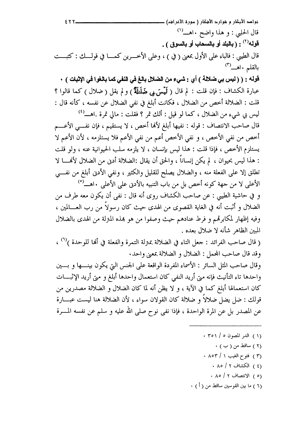 قال صاحب الانتصاف: قوله: نفيها أبلغ لأنَّها أخص، لا يستقيم، فإن نفي الأعم أخص من نفي الأخص، ونفي الأخص أعم من نفي الأعم فلا يستلزمه، لأن الأعم لا يستلزم الأخص، فإذا قلت: هذا ليس بإنسان، لا يلزمه سلب الحيوانية عنه، ولو قلت: هذا ليس بحيوان، لم يكن إنساناً، والحق أن يقال: الضلالة أدنى من الضلال لأنَّها لا تطلق إلا على الفعلة منه، والضلال يصلح للقليل والكثير، ونفي الأدنى أبلغ من نفي الأعلى لا من جهة كونه أخص بل من باب التنبيه بالأدنى على الأعلى. اهـ