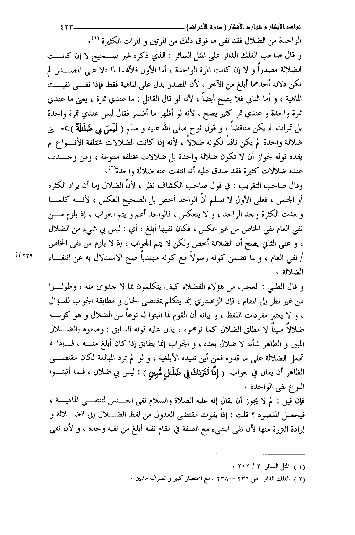 وقال صاحب الفلك الدائر على المثل السائر: الذي ذكره غير صحيح لا إن كانت الضلالة مصدراً ولا إن كانت المرة الواحدة، أما الأول فلأنهما لما دلا على المصدر لم تكن دلالة أحدهما أبلغ من الآخر، لأن المصدر يدل على الماهية فقط فإذا نفى نفيت الماهية، وأما الثاني فلا يصح أيضاً، لأنه لو قال القائل: ما عندي تمرة، يعني ما عندي تمرة واحدة وعندي تمر كثير يصح، لأنه لو أظهر ما أضمر فقال ليس عندي تمرة واحدة بل تمرات لم يكن مناقضاً، وقول نوح صلى الله عليه وسلم (لَيْسَ بِي ضَلالَةٌ) بمعنى ضلالة واحدة لم يكن نافياً لكونه ضلالاً، لأنه إذا كانت الضلالات مختلفة الأنواع لم يفده قوله لجواز أن لا تكون ضلالة واحدة بل ضلالات مختلفة متنوعة، ومن وجدت عنده ضلالات كثيرة فقد صدق عليه أنه انتفت عنه ضلالة واحدة.