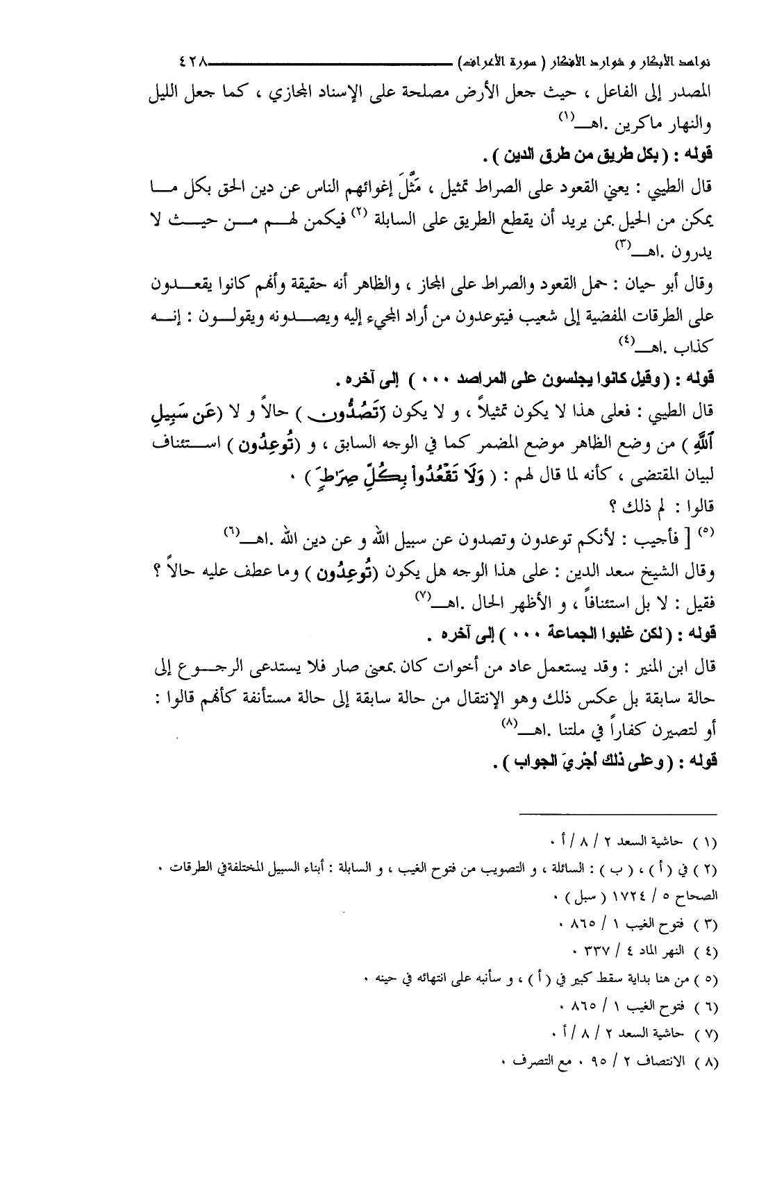 قال الطَّيبي: فعلى هذا لا يكون تمثيلاً، ولا يكون (تَصُدُّونَ) حالاً ولا (عَن سَبِيلِ اللهِ) من وضع الظاهر موضع المضمر كما في الوجه السابق، و (تُوعِدُون) استئناف لبيان المقتضى، كأنه لما قال لهم: (وَلا تَقْعُدُوا بِكُلِّ صِرَاطٍ).