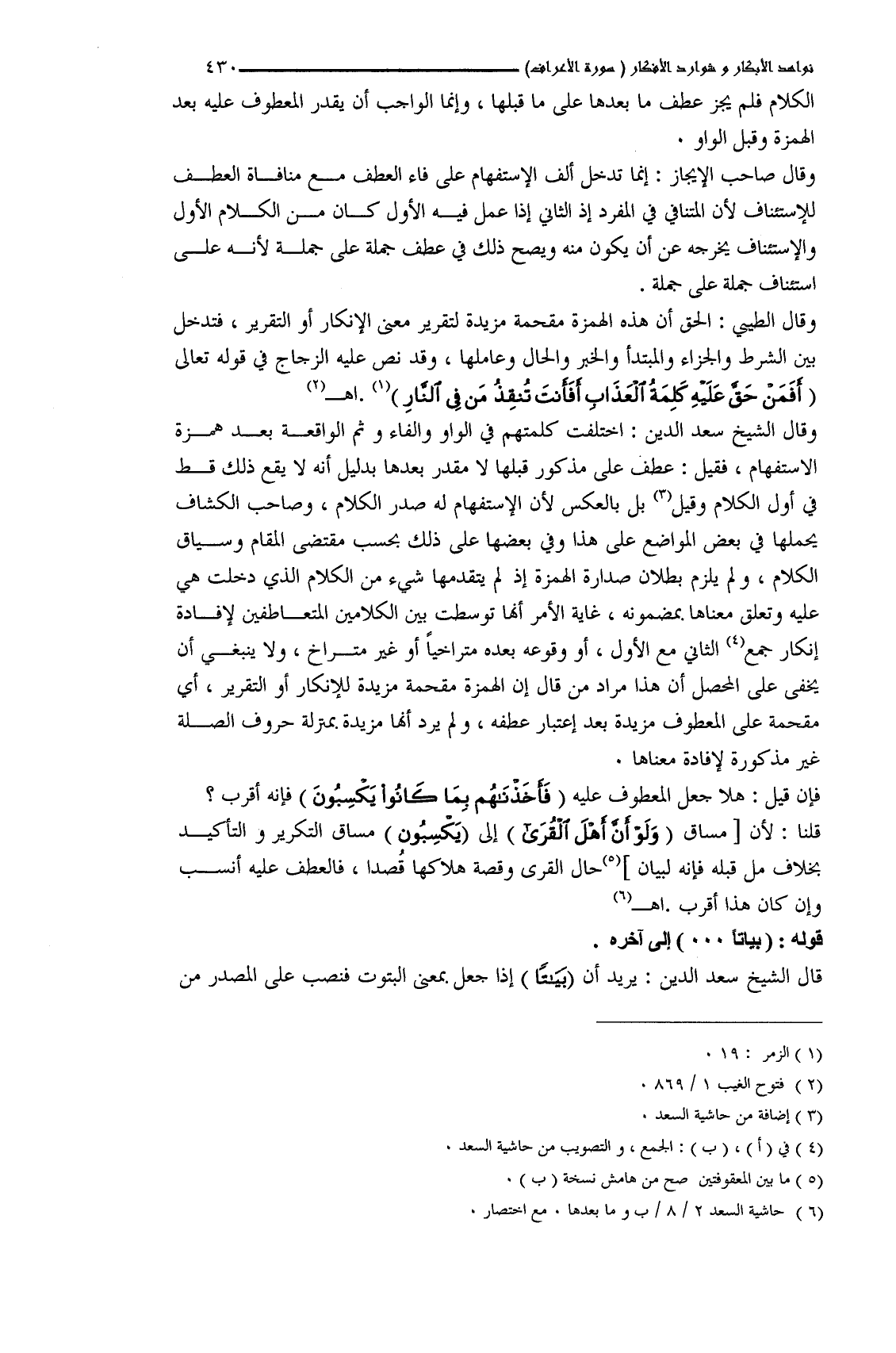 وقال الشيخ سعد الدين: اختلفت كلمتهم في الواو والفاء وثم الواقعة بعد همزة الاستفهام، فقيل: عطفت على مذكور قبلها لا مقدر بعدها بدليل أنه لا يقع ذلك قط في أول الكلام وقيل بل بالعكس لأن الاستفهام له صدر الكلام، وصاحب الكشاف يحملها في بعض المواضع على هذا وفي بعضها على ذلك بحسب مقتضى المقام وسياق الكلام، ولم يلزم بطلان صدارة الهمزة إذ لم يتقدمها شيء من الكلام الذي دخلت هي عليه وتعلق معناها بمضمونه، غاية الأمر أنَّها توسطت بين الكلامين المتعاطفين لإفادة إنكار جمع الثاني مع الأول، أو وقوعه بعده متراخياً أو غير متراخ، ولا ينبغي أن يخفى على المحصل أن هذا مراد من قال إن الهمزة مقحمة مزيدة للإنكار أو التقرير، أي مقحمة على المعطوف مزيدة بعد إعتبار عطفه، ولم يرد أنَّها مزيدة بمنزلة حروف الصلة غير مذكورة لإفادة معناها.