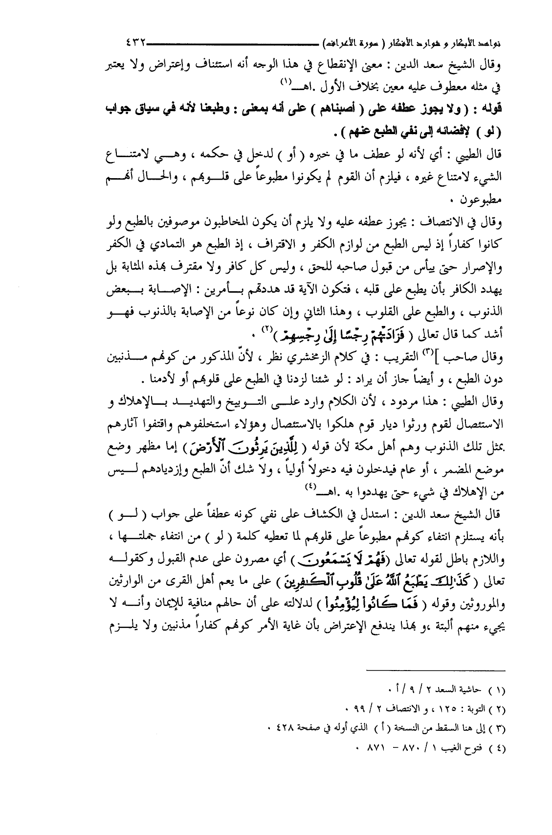قوله: (ولا يجوز عطفه على (أصبناهم) على أنه بمعنى: وطبعنا لأنه في سياقه جواب (لو) لإفضائه إلى نفي الطبع عنهم).