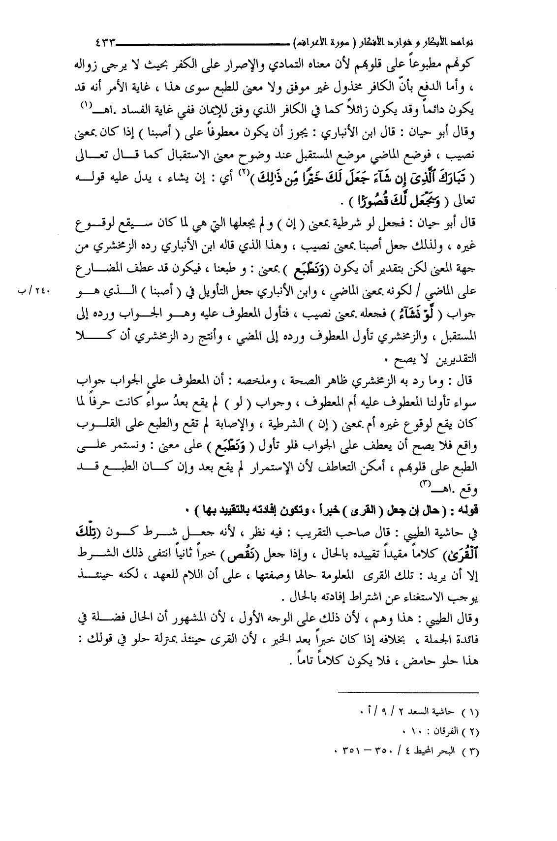 قال: وما رد به الزمخشري ظاهر الصحة، وملخصه: أن المعطوف على الجواب جواب سواء تأولنا المعطوف عليه أم المعطوف، وجواب (لو) لم يقع بعدُ سواءً كانت حرفاً لما كان يقع لوقوع غيره أم بمعنى (إن) الشرطية، والإصابة لم تقع والطبع على القلوب واقع فلا يصح أن يعطف على الجواب فلو تأول (وَنَطْبَعُ) على معنى: ونستمر على الطبع على قلوبهم، أمكن التعاطف لأن الاستمرار لم يقع بعد وإن كان الطبع قد وقع. اهـ