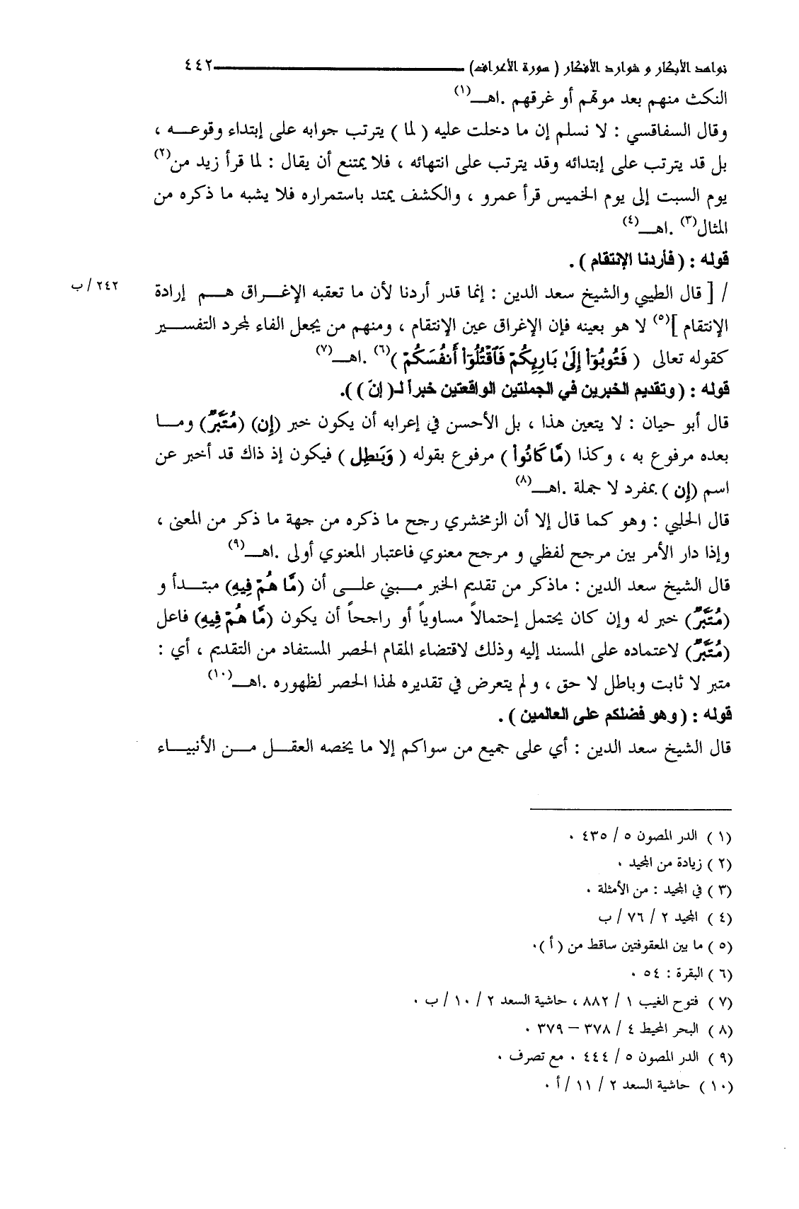 قال الشيخ سعد الدين: ما ذكر من تقديم الخبر مبني على أن (ما هُم فيهِ) مبتدأ و (مُتَبَّرٌ) خبر له وإن كان يحتمل احتمالاً مساوياً أو راجحاً أن يكون (ما هُمْ فيهِ) فاعل (مُتَبَّرٌ) لاعتماده على المسند إليه وذلك لاقتضاء المقام الحصر المستفاد من التقديم، أي: (مُتَبَّرٌ) لا ثابت وباطل لا حق، ولم يتعرض في تقديره لهذا الحصر لظهوره. اهـ