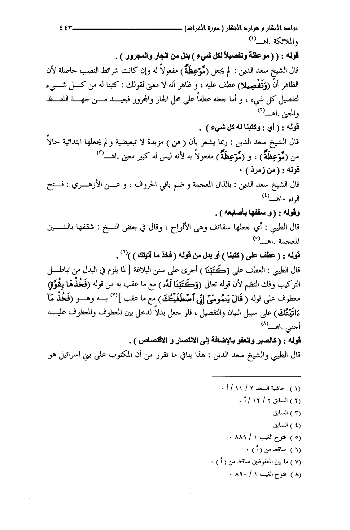 قال الشيخ سعد الدين: لم يجعل (مَوْعِظَةً) مفعولاً له وإن كانت شرائط النصب حاصلة لأن الظاهر أنَّ (وَتَفْصِيلاً) عطف عليه، وظاهر أنه لا معنى لقولك: كتبنا له من كل شىء لتفصيل كل شيء، وأما جعله عطفاً على محل الجار والمجرور فبعيد من جهة اللفظ والمعنى. اهـ