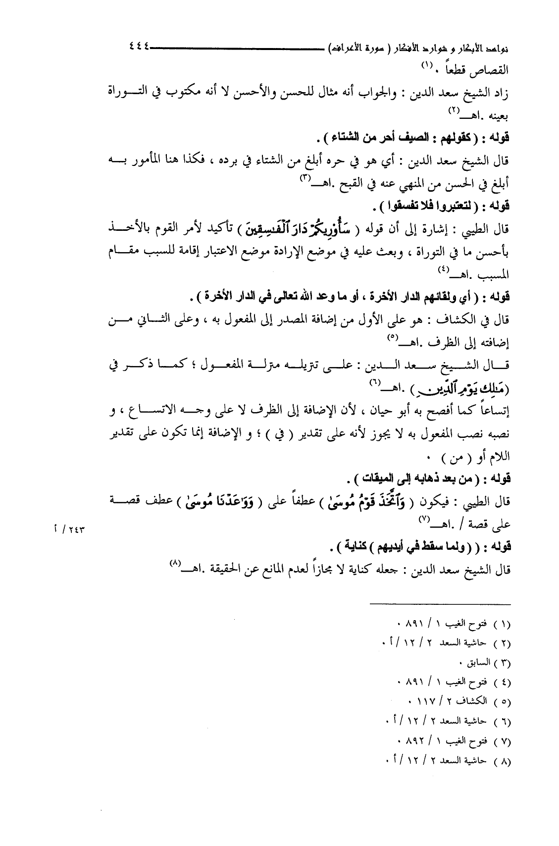قال الطَّيبي: إشارة إلى أن قوله (سَأُرِيكُمْ دَارَ الْفَاسِقِينَ) تأكيد لأمر القوم بالأخذ بأحسن ما في التوراة، وبعث عليه في موضع الإرادة موضع الاعتبار إقامة للسبب مقام المسبب. اهـ