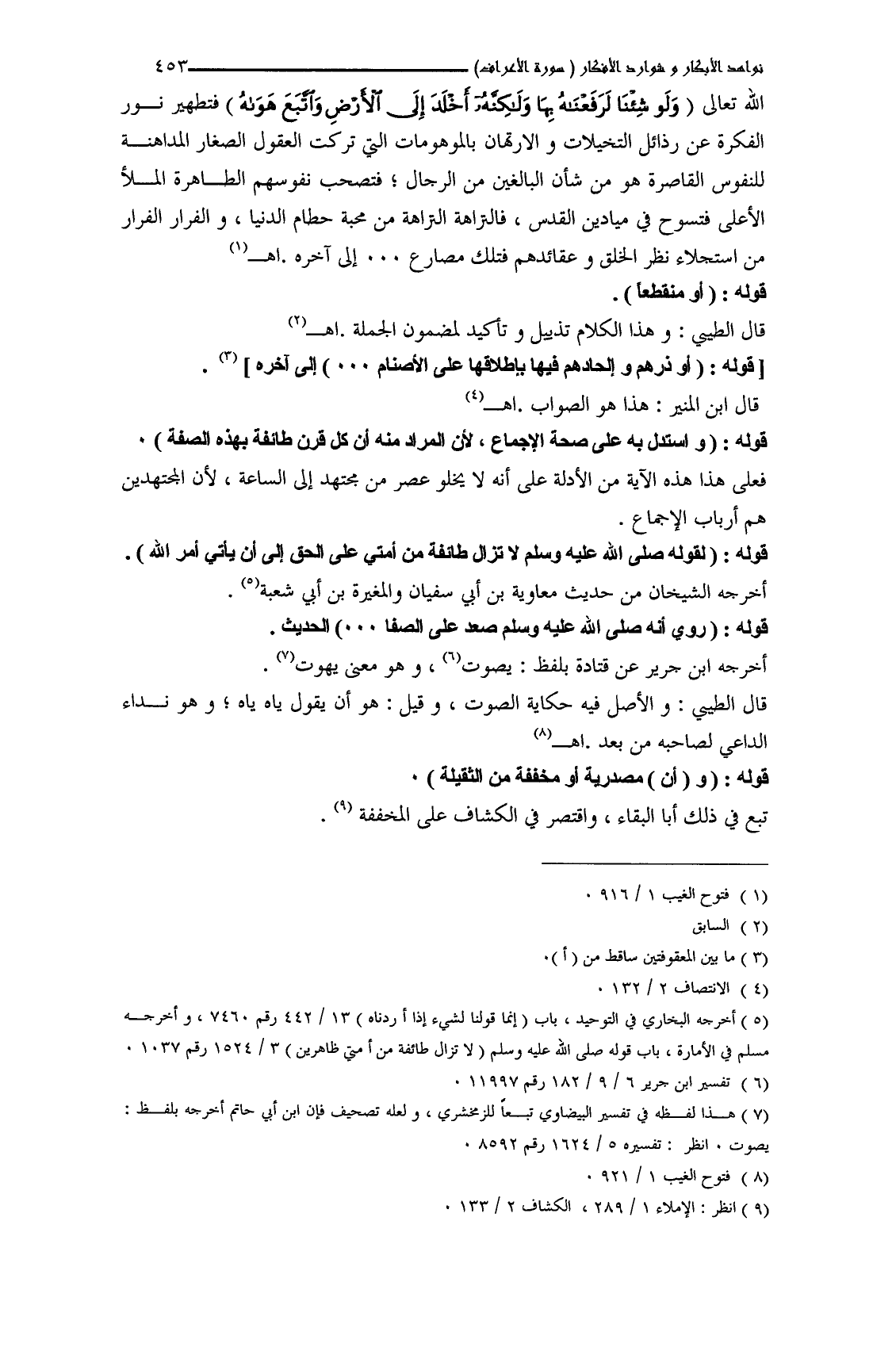 الله تعالى (وَلَوْ شِئْنَا لَرَفَعْنَاهُ بِهَا وَلَكِنَّهُ أَخْلَدَ إِلَى الْأَرْضِ وَاتَّبَعَ هَوَاهُ) فتطهير نور الفكرة عن رذائل التخيلات والارتهان بالموهومات التي تركت العقول الصغار المداهنة للنفوس القاصرة هو من شأن البالغين من الرجال؛ فتصحب نفوسهم الطاهرة الملأ الأعلى فتسوح في ميادين القدس، فالنزاهة النزاهة من محبة حطام الدنيا، والفرار الفرار من استجلاء نظر الخلق وعقائدهم فتلك مصارع ... إلى آخره. اهـ