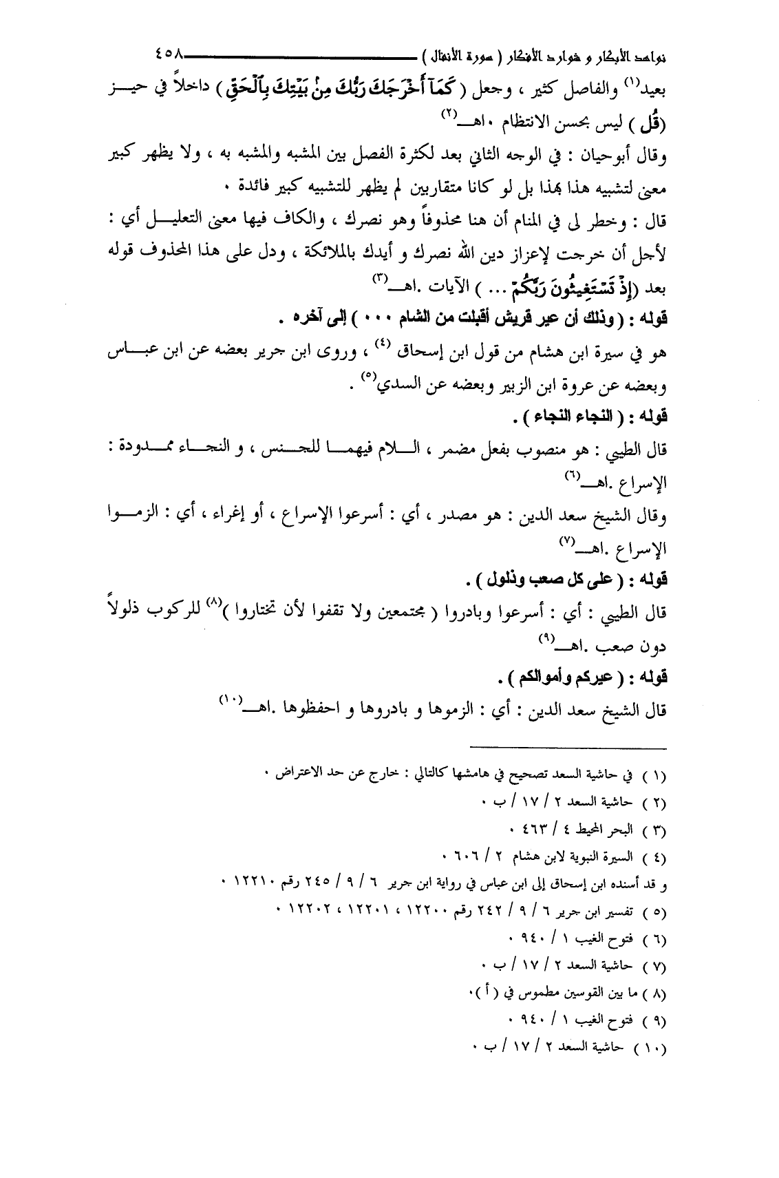 قال: وخطر لي في المنام أن هنا محذوفاً وهو نصرك، والكاف فيها معنى التعليل أي: لأجل أن خرجت لإعزاز دين الله نصرك وأيدك بالملائكة، ودل على هذا المحذوف قوله بعد (إِذْ تَسْتَغِيثُونَ رَبَّكُمْ ... ) الآيات. اهـ